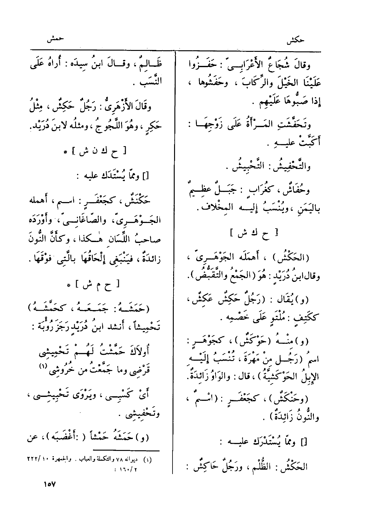 . الحَكْشُ، أَهْمَلَه الجَوْهَرِيّ، وَقَالَ ابنُ دُرَيْدٍ: هُوَ الجَمْعُ والتَّقَبُّضُ. ويُقَال: رَجُلٌ حَكِشٌ عَكِشٌ، ككَتِفٍ: مُلْتَوٍ عَلَى خَصْمِه. ومِنْهُ حَوْكَشٌ، كجَوْهَرٍ: اسمُ رَجُل مِنْ مَهْرَةَ، تُنْسَبُ إِلَيْه الإِبِلُ الحَوْكَشِيَّةُ، قَالَ: والوَاوُ زَائِدَةٌ. وحَنْكَشٌ، كجَعْفَرٍ: اسْمٌ، والنُّونُ زَائِدَةٌ. وممّا يُسْتَدْرَك عَلَيْهِ: الحَكْشُ: الظُّلْم، ورَجُلٌ حَاكِشٌ: ظَالِمٌ، وقالَ ابنُ سِيدَه: أُراهُ عَلَى النَّسَب. وقَالَ الأَزْهَرِيُّ: رَجُلٌ حَكِشٌ، مِثْلُ حَكِرٍ، وهُوَ اللَّجُوجُ، ومثلُه لابنَ دُرَيْدٍ.
