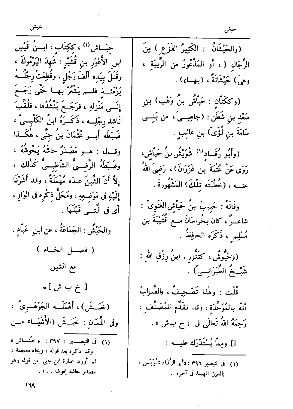 للمُصَنِّفِ، رَحِمَهُ اللهُ تَعالَى فِي ح ب ش. ومِمّا يُسْتَدْرَك عَلَيْهِ:} حِيَاش، ككِتَابٍ، ابنُ قَيْسِ ابنِ الأَعْوَرِ بنِ قُشَيْرٍ: شَهِدَ اليَرْمُوكَ، وقَتَلَ بِيَدِه أَلْفَ رَجُلٍ، وقُطِعَتْ رِجْلُهُ يَوْمَئذٍ فَلم يَشْعُرْ بهَا حَتَّى رَجَعَ إلَى مَنْزلهِ، فرَجَعَ يَنْشُدُها، فلُقِّبَ نَاشِد رِجْلِه، ذَكَرَهُ ابنُ الكَلْبِيّ، ضَبَطَه أَبو عُثْمَانَ بنُ جِنِّى، هكَذا وَقَالَ: هُوَ مَصْدَرُ حاشَهُ ويَحُوشُهُ، وضَبَطَهُ الرَّضِيُّ الشّاطِبِيُّ كَذلك، إِلاَّ أَنّ الشِّينَ عندَه مُهْمَلَةٌ، وَقد أَشَرْنَا إلَيْهِ فِي مَوْضِعِهِ، ومَحَلُّ ذِكْرِه فِي الوَاوِ، أَي فِي الَّتي قَبْلَهَا.! والحَيْشُ: الجَمَاعَةُ، عَن ابنِ عَبّادٍ.