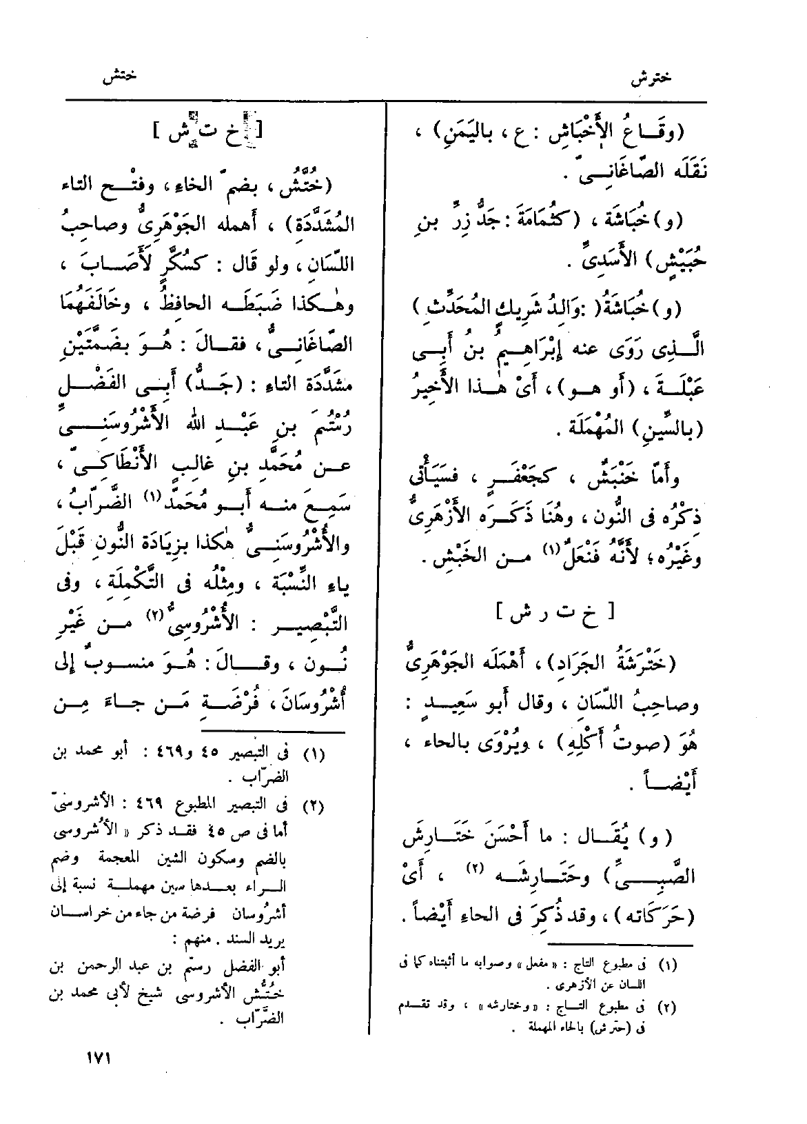 . خُتَّشُ، بضمّ الخاءِ، وفتْح التَّاء المُشَدَّدَةِ، أَهمله الجَوْهَرِيُّ وصاحِبُ اللّسَانِ، وَلَو قَال: كسُكَّرٍ لأَصَابَ، وَهَكَذَا ضَبَطَه الحافِظُ، وخَالَفَهُمَا الصّاغَانِيّ، فقالَ: هُوَ بضَمَّتَيْنِ مشَدَّدَة التاءِ: جَدُّ أَبِي الفَضْلِ رُسْتُمَ بنِ عَبْدِ الله الأَشْرُوسَنِيِّ عَن مُحَمَّدِ بنِ غالِبٍ الأَنْطَاكِيّ، سَمِعَ مِنْهُ أَبو مُحَمّد الضَّرّابُ، والأُشْرُوسَنِيُّ هَكَذَا بِزيَادَة النُّونِ قَبْلَ ياءِ النِّسْبَة، ومِثْلُه فِي التَّكْمِلَةِ، وَفِي التَّبْصِير: الأَشْرُوسِيُّ من غَيْرِ نُون، وقالَ: هُوَ مَنْسُوب إِلَى أُشْرُوسَانَ، فُرْضَةِ مَن جاءَ مِن