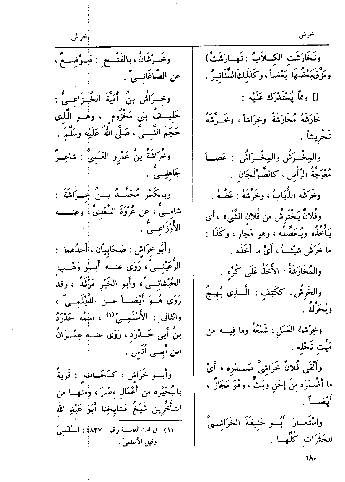وفُلانٌ يَخْتَرِشُ من فُلانٍ الشّيْءِ، أَي يَأْخُذُه ويُحَصِّلُه، وَهُوَ مَجاز، وكَذَا مَا خَرَشَ شيْئاً، أَيْ مَا أَخَذَه. والمُخَارَشَةُ: الأَخْذُ عَلَى كُرْهٍ. والخَرْشُ، ككَتِفٍ: الَّذِي يُهِيجُ ويُحَرِّكُ. وخِرْشاءُ العَسَلِ: شَمْعُهُ وَمَا فِيه من مَيِّتِ نَحْلِه. وأَلْقَى فُلانٌ خَرَاشِيَّ صَدْرِه أَيْ مَا أَضْمَرَه مِنْ إِحَنٍ وبَثٍّ، وهُوَ مَجَازٌ، أَيْضاً. واسْتَعارَ أَبُو حَنِيفَةَ الخَرَاشِيَّ للحَشَرَاتِ كُلِّها. وخَرْشَانُ، بالفَتْحِ: مَوْضِعٌ، عَن الصّاغَانِيّ. وخِرَاشُ بنُ أُمَيَّةَ الخُزَاعِيُّ: حَلِيفُ بني مَخْزُومٍ، وَهُوَ الَّذِي حَجَمَ النَّبِيَّ، صَلَّى اللهُ عَلَيْه وسَلَّمَ. وخُرَاشَةُ بنُ عَمْروٍ العَبْسِيُّ: شاعِرٌ جَاهِلِيٌّ. وبالكَسْر مُحَمَّدُ بنُ خِرَاشَةَ: شامِيٌّ، عَن عُرْوَةَ السَّعْدِيِّ، وَعنهُ الأَوْزَاعِيُّ. وأَبُو خِرَاشٍ: صَحَابِيّان، أَحدُهما: الرُّعَيْنِيّ، رَوَى عَنهُ أَبو وَهْبٍ الحُبْشانِيّ، وأَبو الخَيْرِ مَرْثَدٌ، وَقد رَوَى هُوَ أَيْضاً عَن الدَّيْلَمِيّ، وَالثَّانِي: الأَسْلَمِيّ، اسمُه حَدْرَدُ بنُ أَبي حَدْرَدٍ، رَوَى عَنهُ عِمْرَانُ ابْن أَبِي أَنَسٍ. وأَبو خَرَاشٍ، كسَحَابٍ: قَريةٌ بالبُحَيْرة من أَعْمَالِ مِصْرَ، وَمِنْهَا من المتأَخِّرِين شَيْخُ مَشايِخِنا أَبُو عَبْدِ اللهِ