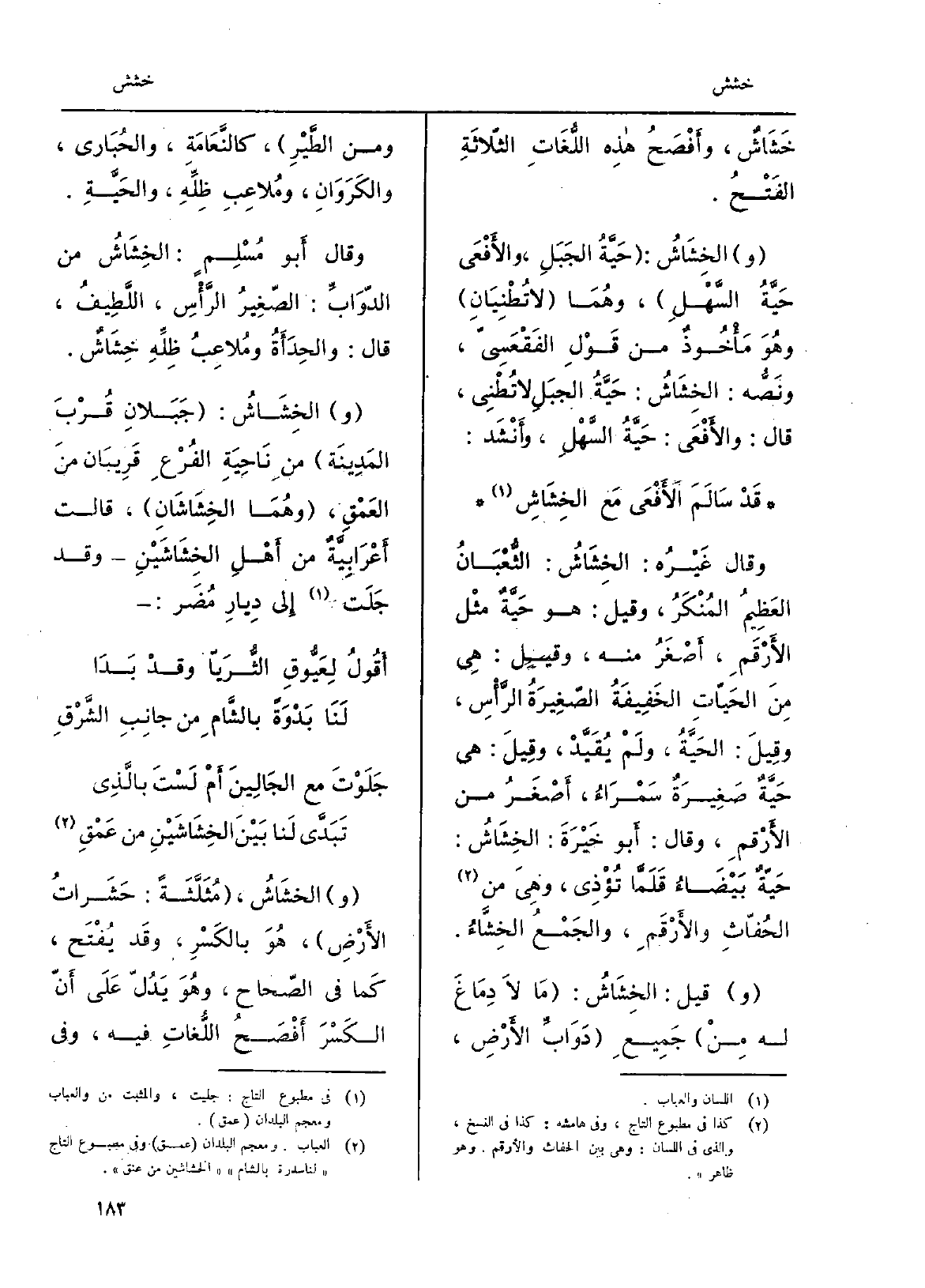 {خَشَاشٌ، وأَفْصَحُ هذِه اللُّغَاتِ الثّلاَثَةِ الفَتْحُ. و} الخِشَاشُ: حَيَّةُ الجَبَلِ، والأَفْعَى حَيَّةُ السَّهْلِ، وهُمَا لَا تُطْنِيَانِ وهُوَ مَأْخُوذٌ من قَوْلِ الفَقْعَسِيِّ، ونَصُّه: {الخِشَاشُ: حَيَّةُ الجبَلِ لَا تُطْنِى، قَالَ: والأَفْعَى: حَيَّةُ السَّهْلِ، وأَنْشَد: قد سَالَمَ الأَفْعَى مَعَ الخِشَاشِ. وَقَالَ غَيْرُه:} الخِشَاشُ: الثُّعْبَانُ العَظِيمُ المُنْكَرُ، وقيلَ: هُوَ حَيَّةٌ مثْل الأَرْقَمِ، أَصْغَرُ مِنْهُ، وَقيل: هِيَ مِنَ الحَيّاتِ الخَفِيفَةُ الصّغِيرَةُ الرَّأْسِ، وقيلَ: الحَيَّةُ، ولَمْ يُقَيَّدْ، وقِيلَ: هِيَ حَيَّةٌ صَغِيرةٌ سَمْرَاءُ، أَصْغَرُ من الأَرْقمِ، وَقَالَ: أَبو خَيْرَةَ: {الخِشَاشُ: حَيّةٌ بَيْضَاءُ قَلَمَّا تُؤْذِي، وهِيَ من الحُفّاثِ والأَرْقَمِ، والجَمْعُ} الخِشَّاءُ. وَقيل: الخِشَاشُ: مَا لاَ دِماغَ لَهُ مِنْ جَمِيعِ دَوَابِّ الأَرْضِ، وَمن الطَّيْرِ، كالنَّعَامَةِ، والحُبَارى، والكَرَوَانِ، ومُلاعِبِ ظِلِّهِ، والحَيَّةِ. وَقَالَ أَبو مُسْلِمٍ: الخِشَاشُ من الدّوَابِّ: الصّغِيرُ الرَّأْسِ، اللَّطِيفُ، قَالَ: والحِدَأَةُ ومُلاعِبُ ظِلِّهِ خِشَاشٌ.