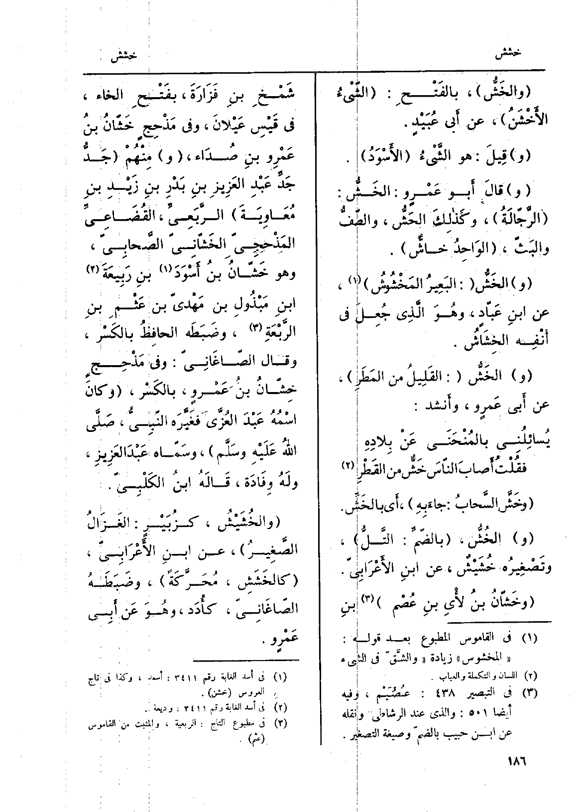 {وخَشَّ السَّحابُ: جاءَ بِهِ، أَي بالخَشِّ. و} الخُشُّ، بالضّمِّ: التَّلُّ، وتَصْغِيرُه {خُشَيْشٌ، عَن ابنِ الأَعْرَابِيّ.} وخَشّانُ بنُ لأْيِ بنِ عُصْم بنِ شَمْخِ بنِ فَزَارَةَ، بفَتْحِ الْخَاء، فِي قَيْسِ عَيْلانَ، وَفِي) مَذْحِجٍ {خَشّانُ بنُ عَمْرِو بنِ صُدَاء، ومِنْهُمْ جَدُّ جَدِّ عَبْدِ العَزِيزِ بنِ بَدْرِ بنِ زَيْدِ بنِ مُعَاوِيَةَ الرَّبَعِيِّ، القُضَاعِيِّ المَذْحجِيّ} - الخَشّانِيّ الصَّحابِيّ، وَهُوَ {خَشّانُ بنُ أَسْوَدَ بنِ رَبِيعَةَ ابنِ مَبْذُولِ بن مَهْديّ بن عَثْمِ بنِ الرَّبْعَةِ، وضَبَطَه الحافِظُ بالكَسْر، وَقَالَ الصّاغَانِيّ: وَفِي مَذْحِجٍ خِشّانُ بنُ عَمْروٍ، بالكَسْر، وكانَ اسْمُهُ عَبْدَ العُزَّي فغَيَّرَه النّبِيُّ، صَلَّى اللهُ عَلَيْهِ وسَلَّم، وسَمّاه عَبْدَ العَزِيزِ، ولَهُ وِفَادضةَ، قَالَهُ ابنُ الكَلْبِيّ.} والخُشَيْشُ، كزُبَيْرٍ: الغَزَالُ الصَّغِيرُ، عَن ابنِ الأَعْرَابِيّ،! كالخَشَشِ، مُحَرَّكَةً، وضَبَطَهُ الصّاغَانِيّ، كأُدَد، وهُوَ عَن أَبِي عَمْروِ.