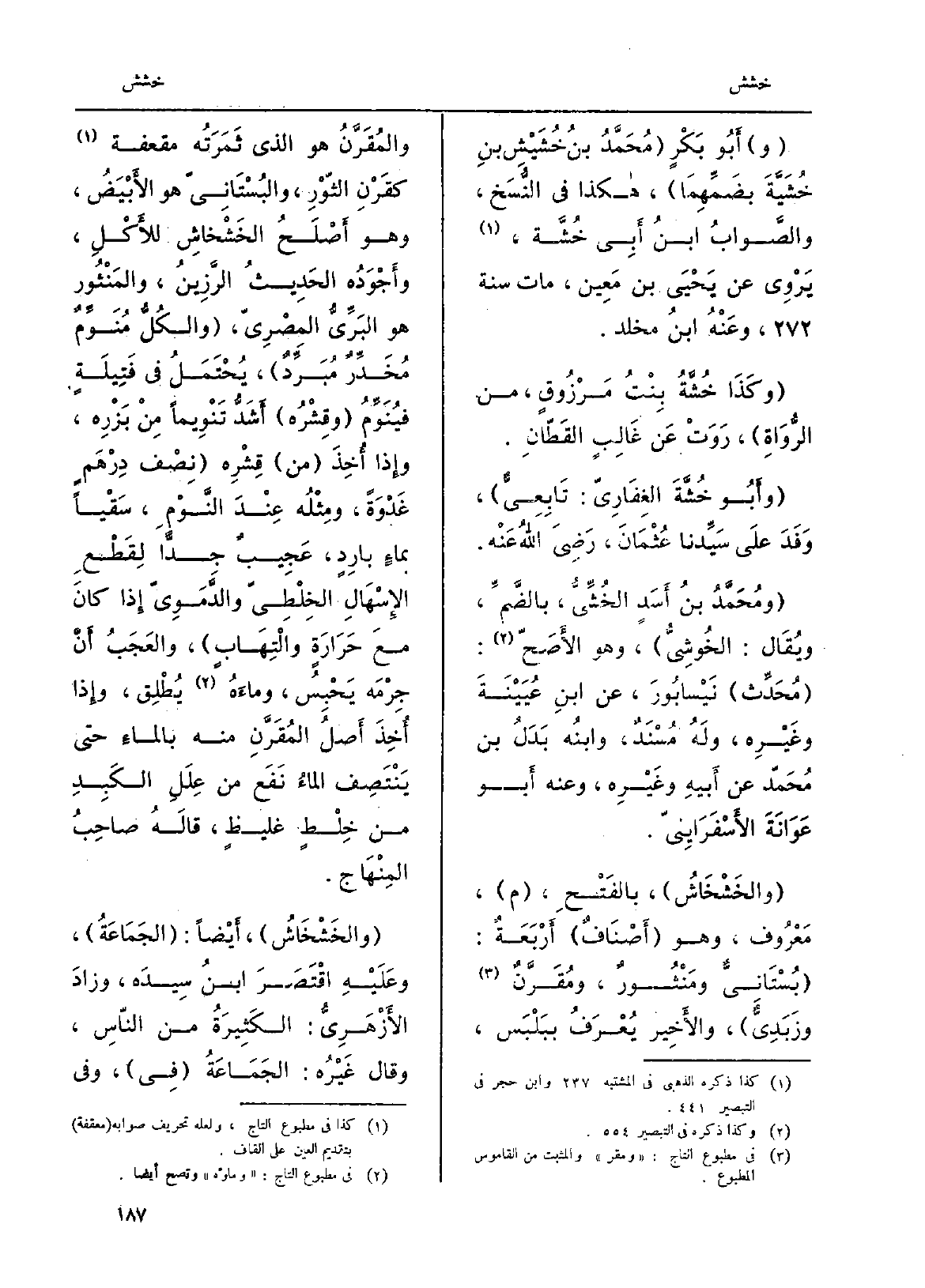 وأَبُو خُشَّةَ الغِفَارِيّ: تَابِعِيُّ، وَفَدَ علَى سَيِّدنا عُثْمَانَ، رَضِيَ اللهُ عَنْه. ومُحَمَّدُ بنُ أَسَدٍ {- الخُشِّيُّ، بالضَّمِّ، ويُقَال: الخُوشِيُّ، وَهُوَ الأَصَحّ، مُحَدِّث نَيْسابُورَ، عَن ابنِ عُيَيْنضةَ وغَيْرِه، ولَهُ مُسْنَدٌ، وابنُه بَدَل بن مُحَمّد عَن أَبيهِ وغَيْرِه، وَعنهُ أَبُو عَوَانَةَ الأَسْفَراينِيّ.} والخَشْخَاشُ، بالفَتْحِ، م، مَعْرُوف، وَهُوَ أَصْنَافٌ أَرْبَعَةٌ: بُسْتَانِيٌّ ومَنْثُورٌ، ومُقَرَّنٌ وزَبَدِيٌّ، والأَخِير يُعْرَفُ ببَلْبَس، والمُقَرَّنُ هُوَ الَّذِي ثَمَرَتُه مقعفة كقَرْنِ الثّوْرِ، والبُسْتَانِيّ هُوَ الأَبْيَضُ، وَهُوَ أَصْلَحُ! الخَشْخاشِ للأَكْلِ، وأَجْوَدُه الحَدِيثُ الرَّزِينُ، والمَنْثُور هُوَ البَرِّيُّ المِصْرِيّ، والكُلُّ مُنَوِّمٌ مُخَدِّرٌ مُبَرِّدٌ، يُحْتَمَلُ فِي فَتِيلَةٍ فيُنَوِّمُ وقِشْرُه أَشَدُّ تَنْوِيماً مِنْ بَزْرِه، وإِذا أُخِذَ من قِشْرِه نِصْف دِرْهَمٍ غَدْوَةً، ومِثْلُه عِنْدَ النَّوْمِ، سَقْياً بماءٍ بارِدٍ، عَجِيبٌ جِداً لِقَطْعِ الإِسْهَالِ الخِلْطِيّ والدَّمَوِيّ إِذا كانَ معَ حَرَارَةٍ والْتِهَابٍ، والعَجَبُ أَنَّ جِرْمَه يَحْبِسُ، وماءَهُ يُطْلِق، وَإِذا أُخِذَ أَصلُ المُقَرَّنِ مِنْهُ بالماءِ حَتَّى يَنْتَصِف الماءُ نَفَع من عِلَلِ الكَبِدِ من خِلْطٍ غليظٍ، قالَهُ صاحِبُ المِنْهَاج. والخَشْخَاشُ، أَيْضاً: الجَمَاعَةُ، وعَلَيْهِ اقْتَصَر ابنُ سِيدَه، وزادَ الأَزْهَرِيُّ: الكَثِيرَةُ من النّاسِ، وَقَالَ غَيْرُه: الجَمَاعَةُ فِي، وَفِي