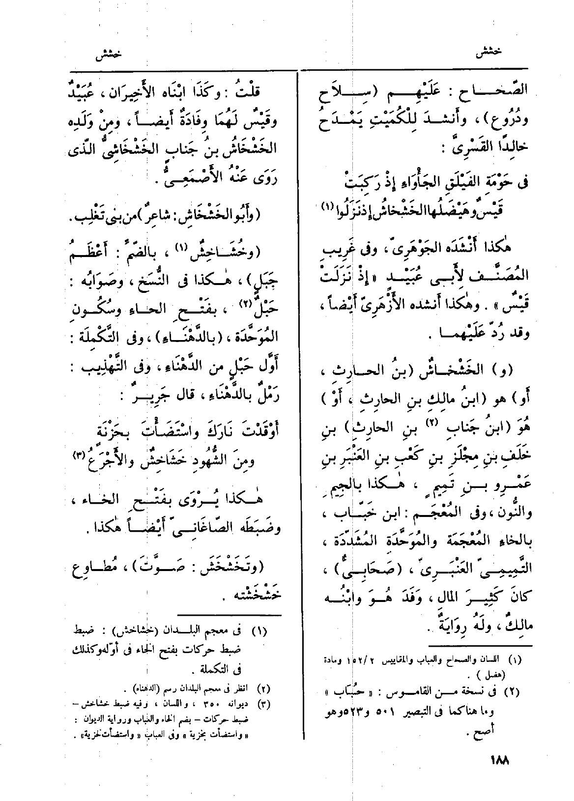 هَكَذَا أَنْشَدَه الجَوْهَرِيّ، وَفِي غَرِيبِ المُصَنَّفِ لأَبِي عُبَيْد إِذ نَزَلَتْ قَيْسٌ. وَهَكَذَا أَنشده الأَزْهَرِيّ أَيْضاً، وَقد رُدّ عَلَيْهما. والخَشْخاشٌ بنُ الحارِثِ، أَو هُوَ ابنُ مالِكِ بنِ الحارِثِ، أَو هُوَ ابْن جَنابِ بنِ الحارِثِ بنِ خَلَفِ بنِ مِجْلَزِ بنِ كَعْبِ بنِ العَنْبَرِ بنِ عَمْرو بن تَمِيمٍ، هَكَذَا بالجِيمِ والنُّون، وَفِي المُعْجَم: ابْن خَبّاب، بالخاءِ المُعْجَمَة والمُوَحَّدَةِ المُشَدّدَة، التَّمِيمِيّ العَنْبَرِيّ، صَحَابِيٌّ، كانَ) كَثِيرَ المالِ، وَفَدَ هُوَ وابْنُه مالِكٌ، ولَهُ رِوَايَةٌ. قلتُ: وكَذَا ابْنَاه الأَخِيرَان، عُبَيْدٌ وقَيْسٌ لَهُمَا وِفَادَةٌ أَيضاً، ومِنْ وَلَدِه الخَشْخَاشُ بنُ جَنابٍ الخَشْخَاشِيُّ الّذي رَوَى عَنْهُ الأَصْمَعِيُّ. وأَبُو الخَشْخَاشِ: شاعِرٌ من بني تَغْلِب.} وخُشَاخِشٌ، بالضّمِّ: أَعْظَمُ جَبَلٍ، هَكَذَا فِي النُّسَخ، وصَوَابُه: حَبْلٌ، بفَتْحِ الحاءِ وسُكُونِ المُوَحَّدَة، بالدَّهْنَاءِ، وَفِي التَّكْمِلَة: أَوَّل حَبْلٍ من الدَّهْنَاءِ، وَفِي التَّهْذِيب: رَمْلٌ بالدَّهْنَاءِ، قَالَ جَرِيرٌ: