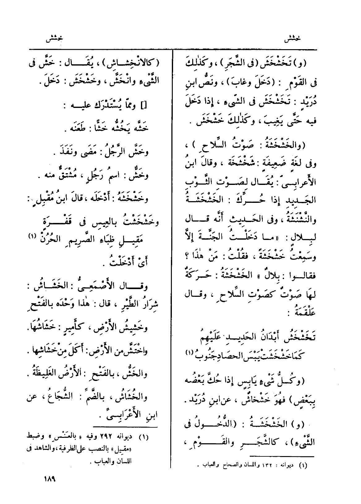وكُلُّ شَئٍ يَابِسٍ إِذا حُكَّ بَعْضُه بِبَعْضٍ فهُوَ {خَشْخاشٌ، عَن ابنِ دُرَيْدٍ. و} الخَشْخَشَةُ: الدُّخُولُ فِي الشَّيْءِ، كالشَّجَرِ والقَوْمِ، {كالانْخِشاشِ يُقَال:} خَشَّ فِي الشَّيْءِ {وانْخَشَّ،} وخَشْخَشَ: دَخَلَ. وممّا يُسْتَدْرَك عَلَيْهِ: {خَشَّه} يَخُشُّه {خَشّاً: طَعَنَه.} وخَشَّ الرَّجُلُ: مَضَى ونَفَذَ. وخَشٌّ: اسمُ رَجُلٍ، مُشْتَقٌّ مِنْهُ. {وخَشْخَشَهُ: أَدْخَلَه، قالَ ابنُ مُقْبِلٍ: