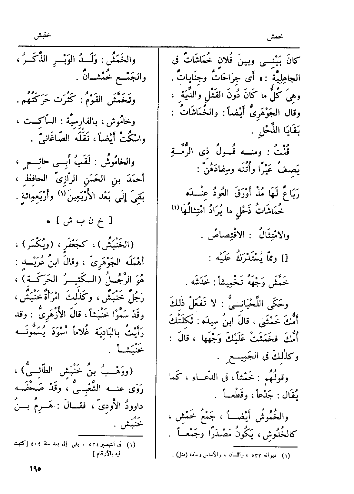كانَ بَيْنِي وبينَ فُلانٍ خُمَاشَاٌ ت فِي الجاهِلِيَّة: أَي جِرَاحَاتٌ وجِنَاياتٌ. وهِيَ كُلُّ مَا كَانَ دُونَ القَتْلِ والدِّيَةِ، وَقَالَ الجَوْهَرِيُّ أَيْضاً: والخُمَاشَاتُ: بَقَايَا الذَّحْلِ. قُلْتُ: وَمِنْه قَولُ ذِي الرُّمَّةِ يَصِفُ عَيْراً وأُتُنَه وسِفادَهُنّ:)