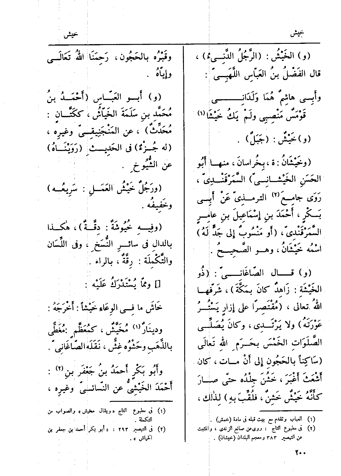 ورَجُلٌ} خَيْشُ العَمَلِ: سَرِيعُه وخَفِيفُه. وفِيهِ {خُيُوشَةٌ: دِقَّةٌ، هَكَذَا بالدالِ فِي سائرِ النُّسَخِ، وَفِي اللِّسَان والتَّكْمِلَة: رِقَّةٌ، بالراء. وممّا يُسْتَدْرَكُ عَلَيْه:} خَاشَ مَا فِي الوِعَاءِ {خَيْشاً: أَخْرَجَهُ: ودينَارٌ} مُخَيَّشٌ، كمُعْظَّمٍ: مُغَطَّىً بالذَّهَبِ وحَشْوُه غِشٌّ، نَقَلَه الصّاغَانِيّ. وأَبُو بَكْرٍ أَحْمَدُ بنُ جَعْفَر بنِ: أَحْمَدَ! الخَيْشِيُّ عَن النّسائيّ وغيرِه،