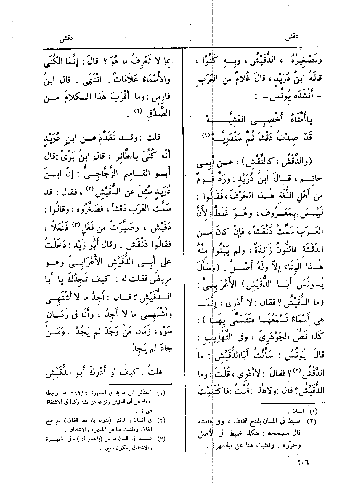 والدَّقْشُ، كالنَّقْشِ، عَن أَبِي حاتِم، قالَ ابنُ دُرَيْدٍ: ورَدَّ قَومٌ من أَهْلِ اللُّغَةِ هَذَا الحَرْفَ، فَقَالوُا: لَيْسَ بِمَعْرُوف، وهُوَ غَلَطٌ لأَنَّ العَرَبَ سَمَّتْ دَنْقَشاً، فإِنْ كانَ من الدّقْشَةِ فالنُّونُ زَائِدَةٌ، وَلم يَبْنُوا مِنْهُ هَذَا البِنَاءَ إلاّ ولَهُ أَصْلٌ. وسَأَلَ يُونُسُ أَبَا الدُّقَيْشِ الأَعْرَابِيَّ: مَا الدُّقَيْشُ فَقَالَ: لَا أَدْرِي، إِنَّمَا هِيَ أَسْمَاءٌ نَسْمَعُهَا فنَتَسَمَّى بِهَا: كَذا نَصُّ الجَوْهَرِيّ، وَفِي التَّهْذِيبِ: قالَ يُونُسُ: سَأَلْتُ أَبَا الدُّقَيْشِ: مَا الدَّقْشُ فقالَ: لَا أَدْرِي، قُلْتُ: وَمَا الدُّقَيْشُ قَالَ: وَلَا هَذَا: قُلْتُ: فاكْتَنَيْتْ بِمَا لَا تَعْرِفُ مَا هُوَ قالَ: إِنَّمَا الكُنَى والأَسْمَاءُ عَلاَمَاتٌ. انْتَهَى. قَالَ ابنُ فارِسٍ: وَمَا أَقْرَبَ هَذَا الكلامَ من الصِّدْقِ. قلت: وَقد تَقَدَّم عَن ابنِ دُرَيْدٍ أَنّه كُنِّىَ بالطَّائِر، قَالَ ابنُ بَرّيّ: قَالَ أَبو القاسِم الزَّجَّاجِيُّ: إنّ ابنَ دُرَيْدٍ سُئِلَ عَن الدُّقَيْشِ، فَقَالَ: قد سَمَّت العَرَب دَقشاً، فصَغَّرُوه، وقالُوا: دُقَيْش، وصَيَّرَتْ من فَعْلٍ فَنْعَلاً، فقالُوا دَنْقَش. وَقَالَ أَبُو زَيْد: دَخَلْتُ على أبَيِ الدُّقَيْشِ الأَعْرَابِيّ وَهُوَ مرِيضٌ فَقلت لَهُ: كَيفَ تَجِدُكَ يَا أَبا الدُّقَيْشِ قَالَ: أَجِدُ مَا لَا أَشْتَهِي وأَشْتَهِي مَا لَا أَجِدُ، وأَنَا فِي زَمَانِ سَوْءٍ، زَمَانْ مَنْ وَجَدَ لم يَجُدْ، وَمَنْ جادَ لم يَجِدْ. قلتُ: كَيفَ لَو أَدْركَ أَبو الدُّقَيْشِ