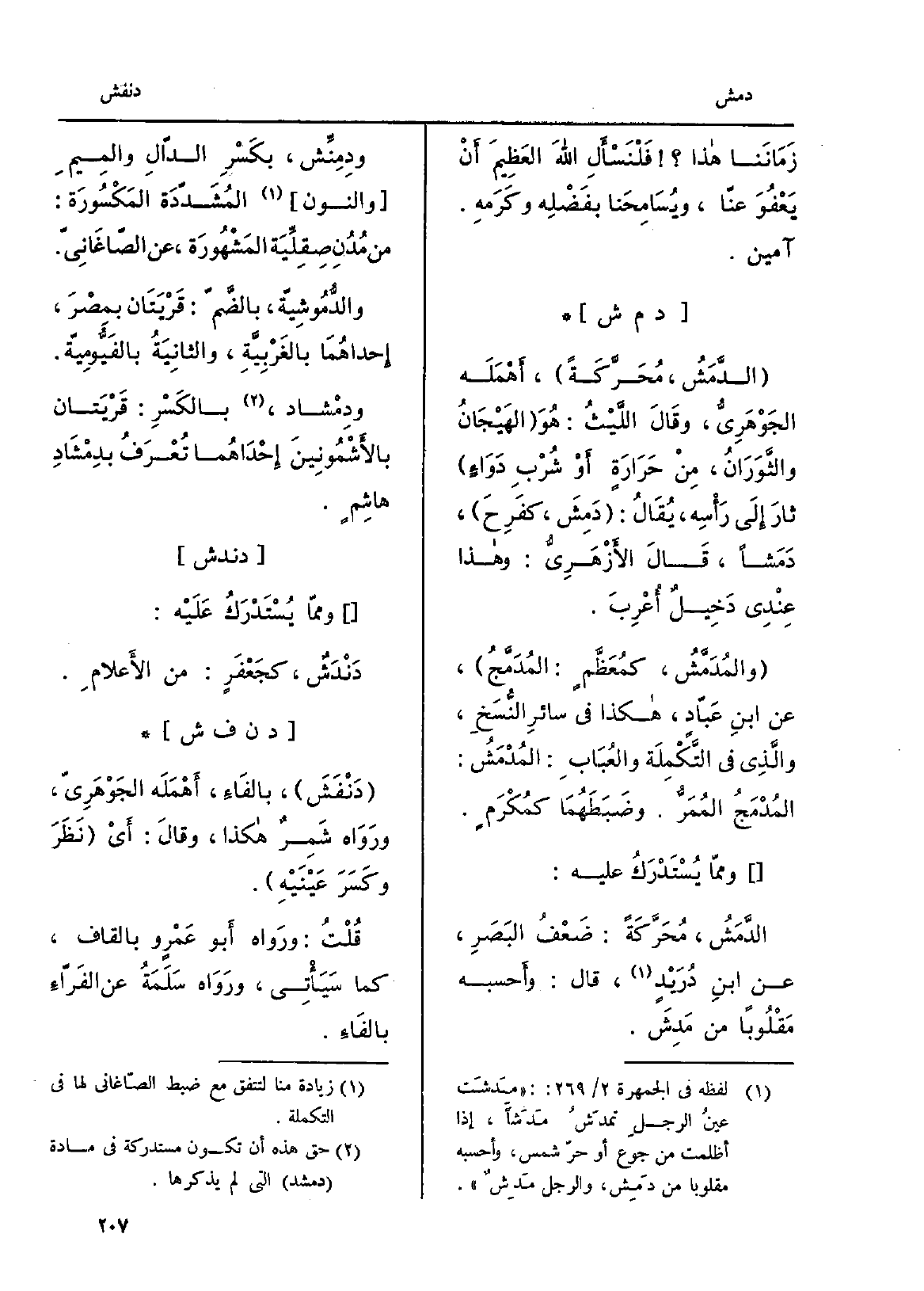 والمُدَمَّشُ، كمُعَظَّمٍ: المُدَمَّجُ، عَن ابنِ عَبّادٍ، هَكَذَا فِي سائرِ النُّسَخِ، والَّذِي فِي التَّكْمِلَة والعُبَابِ: المُدْمَشُ: المُدْمَجُ المُمَرُّ. وضَبَطَهُمَا كمُكْرَمٍ. وممّا يُسْتَدْرَكُ عَلَيْهِ: الدَّمَشُ، مُحَرَّكَةً: ضَعْفُ البَصَرِ، عَن ابنِ دُرَيْدٍ، قَالَ: وأَحسبه مَقْلُوباً من مَدْشَ. ودِمِنِّش، بكَسْرِ الدّالِ والمِيمِ وَالنُّون المُشَدّدَة المَكْسُورَة: من مُدُنِ صِقِلِّيَة المَشْهُورَة، عَن الصّاغَانِيّ. والدُّمُوشِيّة، بالضّمّ: قَرْيَتَان بمِصْرَ، إحداهُمَا بالغَرْبِيَّةِ، والثانِيَةُ بالفَيُّوِميّة. ودِمْشاد، بالكَسْرِ: قَرْيَتان بالأَشْمُونِينَ إحْدَاهُما تُعْرَفُ بدِمْشَادِ هاشِمٍ.