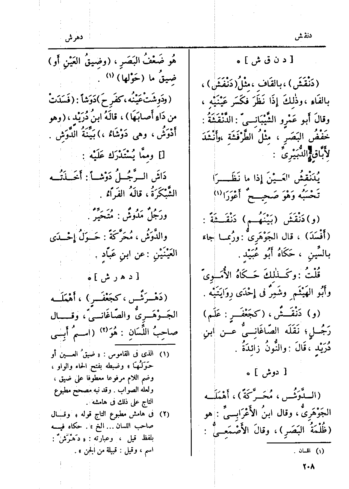 {الدَّوَشُ، مُحَرَّكَةً، أَهْمَلَه الجَوْهَرشيُّ، وَقَالَ ابنُ الأَعْرَابِيِّ: هُوَ ظُلْمَةُ البَصَرِ، وقالَ الأَصْمَعِيُّ: هُو ضَعْفُ البَصَرِ، وضِيقُ العَيْنِ أَو ضِيقُ مَا حَوْلها.} ودَوِشَتْ عَيْنُه، كفَرِحَ {دَوَشاً: فَسَدَتْ من دَاءٍ أَصابَهَا، قالَهُ ابنُ دُرَيْدٍ، وَهُوَ} أَدْوَشُ، وَهِي {دَوْشَاءُ، بَيِّنَةُ} الدَّوَشِ. ومِمَّا يُسْتَدْرَك عَلَيْه: {دَاشَ الرَّجُلُ} دَوْشاً: أَخَذَتُه الشَّبْكَرَةُ، قالَهُ الفَرّاءُ. ورَجُلٌ {مَدُوشٌ: مُتَحَيِّرٌ.} والدَّوَشُ، مُحَرَّكَةً: حَوَلُ إِحْدَى العَيْنَيْنِ: عَن ابنِ عَبّادٍ.
