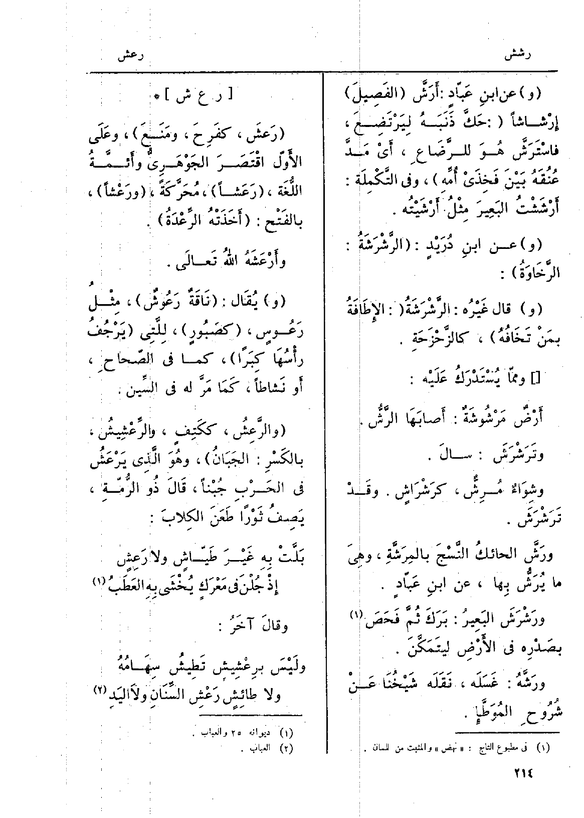وَعَن ابنِ عَبّادٍ: {أَرَشَّ الفَصِيلَ} إِرْشاشاً: حَكَّ ذَنَبَهُ ليَرْتَضِعَ، {فاسْتَرَشَّ هُوَ للرَّضَاعِ، أَيْ مَدَّ عُنُقَهُ بَيْنَ فَخِذَيْ أُمِّهِ، وَفِي التَّكْمِلَة:} أَرْشَشْتُ البَعِيرَ مِثلُ أَرْشَيْتُه. وَعَن ابنِ دُرَيْدٍ: {الرَّشْرَشَةُ: الرَّخَاوَةُ: وَقَالَ غَيْرُه:} الرَّشْرَشَةُ: الإِطَافَةُ بمَنْ تَخَافُهُ، كالزَّحْزَحَةِ. وممّا يُسْتَدْرَكُ عَلَيْه: أَرْضٌ {مَرْشُوشَةٌ: أَصابَهَا الرَّشُّ.} وتَرَشْرَشَ: سالَ. وشِوَاءٌ {مُرِشٌّ،} كرَشْرَاشٍ. وقَدْ {تَرَشْرَشَ.} ورَشَّ الحائكُ النَّسْجَ بالمِرَشَّةِ، وهِيَ مَا يُرَشُّ بِها، عَن ابنِ عَبّادٍ. {ورَشْرَشَ البِعِيرُ: بَرَكَ ثُمَّ فَحَصَ بصَدْرِه فِي الأَرْضِ ليتَمَكَّنَ.} ورَشَّهُ: غَسَلَه، نَقَلَه شَيْخُنَا عَنْ شُرُوحِ المُوَطَّإِ.