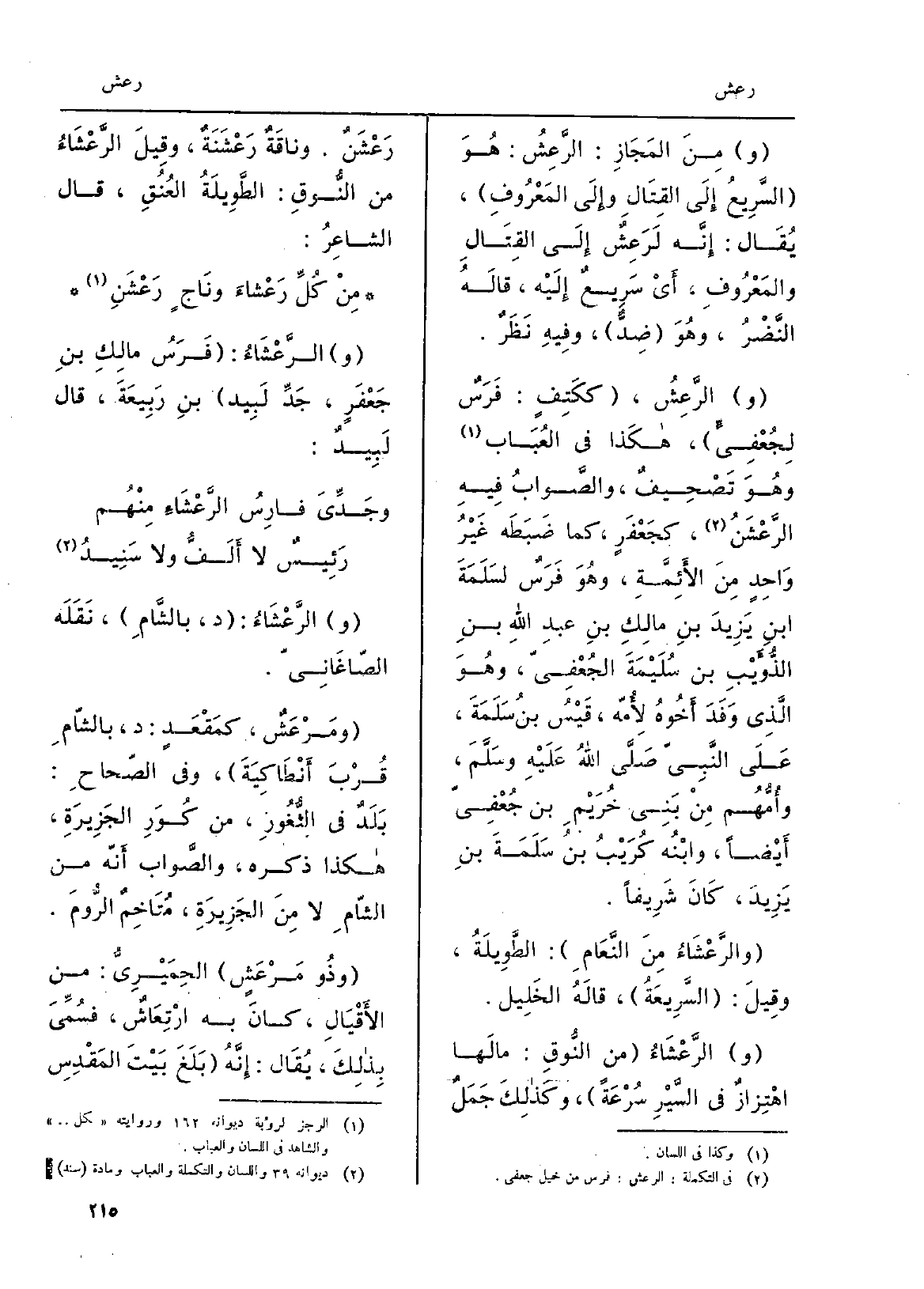 ومِنَ المَجَازِ: الرَّعِشُ: هُوَ السَّرِيعُ إلَى القِتَال وإِلَى المَعْرُوفِ، يُقَال: إِنَّه لَرِعِشٌ إِلَى الِقَتالِ والمَعْرُوفِ، أَيْ سَرِيعٌ إِلَيْه، قالَهُ النَّضْرُ، وهُوَ ضِدٌّ، وفِيهِ نَظَرٌ. والرّعِشُ، ككَتِفٍ: فَرَسٌ لِجُعْفِيٍّ، هكَذا فِي العُبَاب وهُوَ تَصْحِيفٌ، والصَّوابُ فيهِ الرَّعْشَنُ، كجَعْفَرٍ، كَمَا ضَبَطَه غَيْرُ وَاحِدٍ مِنَ الأَئِمَّةِ، وهُوَ فَرَسٌ لسَلَمَةَ ابنِ يَزِيدَ بنِ مالِكِ بنِ عبدِ اللهِ بنِ الذُؤَيْبِ بن سُلَيْمَةَ الجُعْفِيّ، وهُوَ الَّذِي وَفَدَ أَخُوهُ لأُمّه، قَيْسُ بنُ سَلَمَةَ، عَلَى النَّبِيّ صَلَّى اللهُ عَلَيْه وسَلَّمَ، وأُمُّهُم مِنْ بَنِي خُرَيْمِ بن جُعْفِىّ أَيْضاً، وابْنُه كُريْبُ بنُ سَلَمَةَ بنِ يَزِيدَ، كَانَ شَرِيفاً. والرَّعْشَاءُ مِنَ النَّعَامِ: الطَّوِيلَةُ، وقِيلَ: السَّرِيعَةُ، قالَهُ اَلخَلِيل. والرَّعْشَاءُ من النُّوقِ: مالَها اهْتِزازٌ فِي السَّيْرِ سُرْعَةً، وكَذلِكَ جَمَلٌ رَعْشَنٌ. وناقَةٌ رَعْشَنَةٌ، وقِيلَ الرَّعْشَاءُ من النُّوقِ: الطَّوِيلَةُ العُنُقِ، قَالَ الشاعِرُ: مِنْ كُلِّ رَعْشَاءَ ونَاجٍ رَعْشَنِ. والرَّعْشَاءُ: فَرَسُ مالِكِ بنِ جَعْفَرٍ، جَدِّ لَبِيد بنِ رَبِيعَةَ قَالَ لَبِيدٌ: