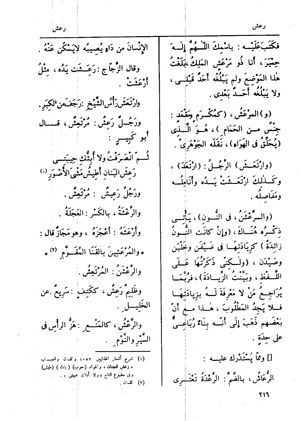 ِ فكَتَبَ عَلَيْه: باسْمِكَ اللهُمَّ إِلهَ حِمْيَرَ، أَنا ذُو مَرْعَشٍ المَلِكُ، بَلَغْتُ هَذَا المَوْضِعَ وَلم يَبْلُغْه أَحَدٌ قَبْلِي، وَلَا يَبْلُغُه أَحَدٌ بَعْدِي. والمرْعَشُ، كمُكْرَمٍ ومَقْعَدٍ: جِنْسٌ من الحَمَامِ، هُوَ الَّذِي يُحَلِّقُ فِي الهَوَاءِ، نَقَلَه الجَوْهَرِيّ. وارْتَعَشَ الرَجُلُ: ارْتَعَدَ، وكَذلِكَ ارْتَعَشْت) يَدُه وأَنَامِلُه ومَفَاصِلُه. والرَّعْشَنُ، فِي النُّونِ، يَأْتِي ذِكْرُه هُنَاكَ، وإِنْ كَانَت النُّونُ زَائِدَةً كزِيَادَتِها فِي ضَيْفَن وخَلْبَن وصَيْدَن، ولكِنّي ذَكَرْتُهَا عَلَى اللَّفْظِ، وبَيَّنْتُ الزِّيَادَةَ، فرُبَّمَا يُرَاجِعُ مَنْ لَا مَعْرِفَةَ لَهُ بِزيادَتِهَا فَلَا يَجِدُ المَطْلوبَ، هَذَا مَعَ أَنّ بَعْضَهم ذَهَبَ إِلَى أَنّه بِنَاءٌ رُبَاعِيٌّ على حِدَةٍ.