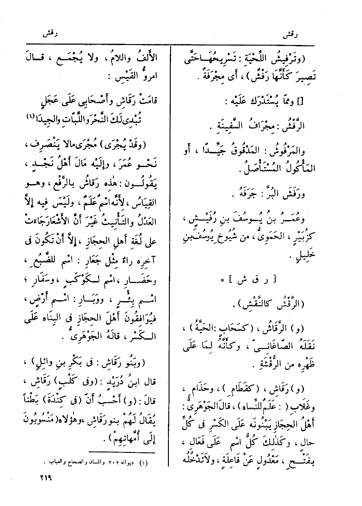 وقَدْ يُجْرَي مُجْرَى مَالا يَنْصَرِف، نَحْو عُمَرَ، وإِلَيْه مَالَ أَهْلُ نَجْدٍ، ويَقُولُون: هذِه رَقاشُ بالرَّفْع، وَهُوَ القِيَاسُ، لأَنَّه اسْمٌ عَلَمٌ، ولَيْسَ فِيه إِلاَّ العَدْلُ والتَأْنِيثُ غَيْرَ أَنَّ الأَشْعَارَ جَاءَتْ على لُغَةِ أَهْلِ الحِجَازِ، إلاَّ أَنْ تَكُونَ فِي آخِرِه راءٌ مِثْل جَعَارِ: اسْم للضَّبُعِ، وحَضَارِ، اسْم لكَوْكَبٍ، وسَفَارِ اسْم بِئْرٍ، ووَبَارِ: اسْم أَرْضٍ، فيُوَافِقُونَ أَهْلَ الحِجَازِ فِي البِنَاءِ عَلَى الكَسْر، قالَهُ الجَوْهَرِيُّ. وبَنُو رِقَاشِ: فِي بَكْرِ بنِ وائِلٍ، قَالَ ابنُ دُرَيْدٍ: وَفِي كَلْبٍ رَقَاشِ، قالَ: وأَحْسبُ أَنّ فِي كِنْدَةَ بَطْناً يُقَالُ لَهُمْ بَنو رَقَاشِ، وهؤلاءِ مَنْسُوبُونَ إِلَى أُمَّهاتِهِمْ.