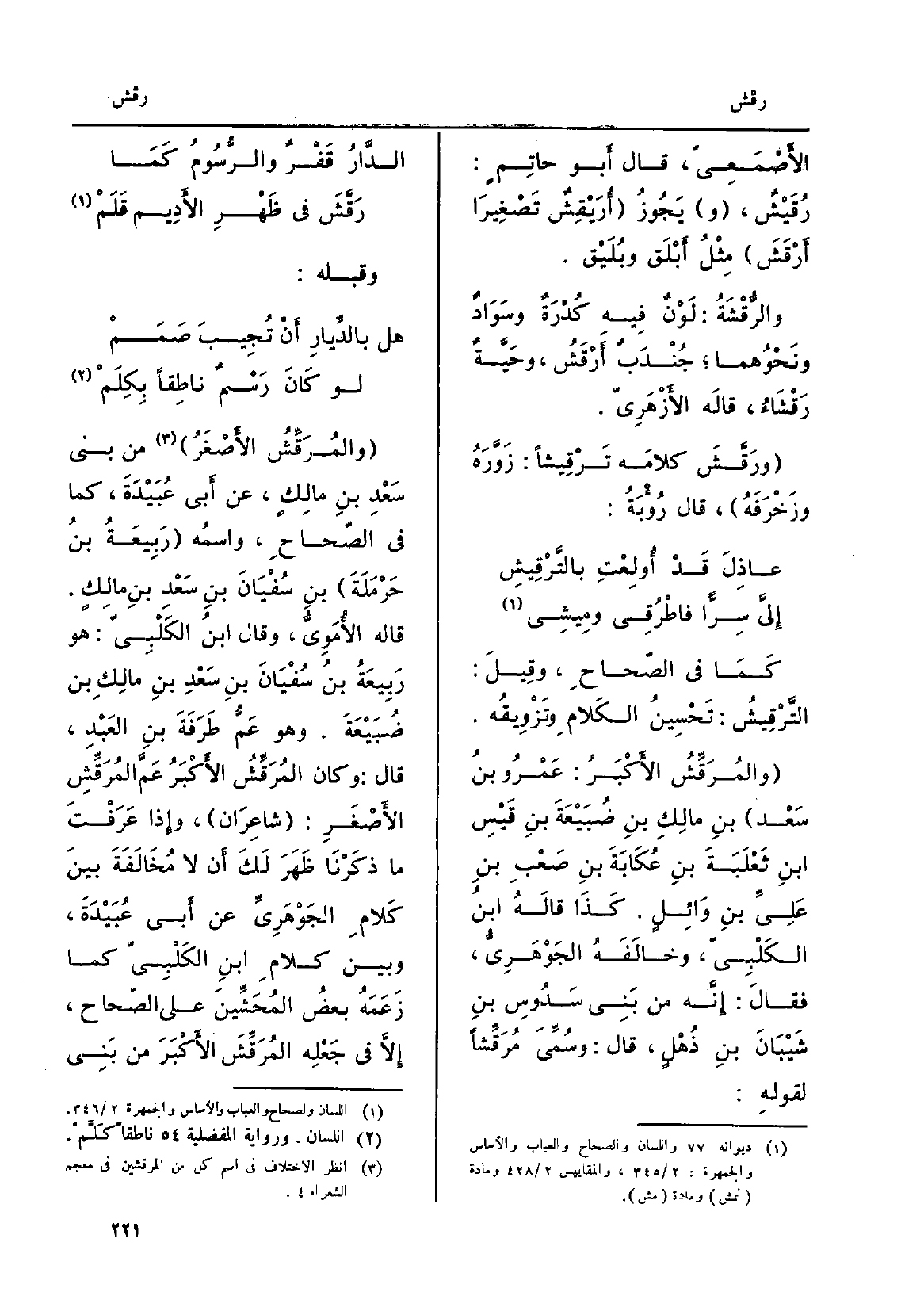 الأَصْمَعِيّ، قَالَ أَبو حاتِمٍ: رُقَيْشٌ، ويَجُوزُ أُرَيْقَشٌ تَصْغِيرَاً أَرْقَشَ مِثْلُ أَبْلَق وبُلَيق. والرَّقْشَةُ: لَوْنٌ فِيه كُدْرَةٌ وسَوَادٌ ونَحْوُهما جُنْدَبٌ أَرْقَشُ، وحَيَّةٌ رَقْشَاءُ، قالَه الأَزْهَرِيّ. ورَقَّشَ كلامَه تَرْقِيشاً: زَوَّرَهُ وزَخْرَفَهُ، قَالَ رُؤْبَةُ: