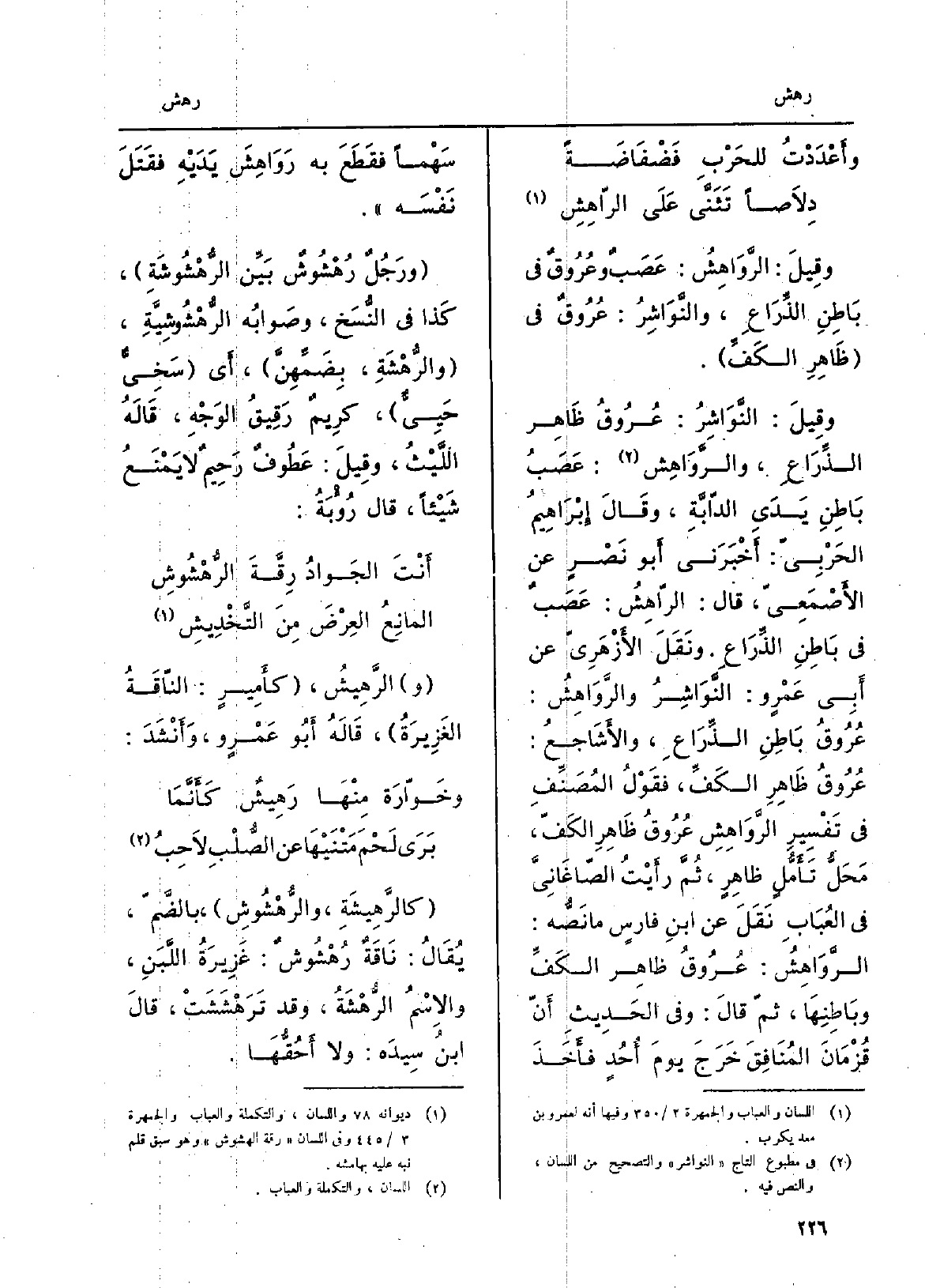 وقِيلَ: الرَّوَاهِشُ: عَصَبٌ وعُرُوقٌ فِي بَاطِنِ الذِّرَاعِ، والنَّوَاشِرُ: عُرُوقٌ فِي ظَاهِرِ الكَفِّ. وقيلَ: النَّوَاشِرُ: عُرُوقُ ظَاهِر الذِّرَاعِ، والرَّوَاهِش: عَصَبُ بَاطِنِ يَدَيِ الدّابَّةِ، وقَالَ إِبْرَاهِيمُ الحَرْبِيّ: أَخْبَرَني أَبو نَصْرٍ عَن الأَصْمَعِيّ، قَالَ: الرّاهِشُ: عَصَبٌ فِي بَاطِنِ الذّرَاعِ. ونَقَلَ الأَزْهَرِيّ عَن أَبِي عَمْروٍ: النَّوَاشِرُ والرَّوَاهِشُ: عُرُوقُ بَاطِنِ الذِّرَاعِ، والأَشَاجعُ: عُرُوقُ ظَاهِرِ الكَفِّ، فقَوْلُ المُصَنِّفِ فِي تَفْسِيرِ الرَّوَاهِشِ عُرُوقُ ظَاهِرِ الكَفّ، مَحَلُّ تَأَمُّلٍ ظَاهِرٍ، ثُمَّ رأَيْتُ الصّاغَانِيّ فِي العُبَابِ نَقَلَ عَن ابنِ فارِسٍ مَا نَصُّه: الرَّوَاهِشُ: عُرُوقُ ظاهِرِ الكَفِّ وبَاطِنِهَا، ثمّ قالَ: وَفِي الحَدِيثِ أَنّ قُزْمَانَ المُنَافِقَ خَرَجَ يومَ أُحْدٍ فَأَخَذَ سَهْماً فقَطَعَ بِهِ رَوَاهِشَ يَدَيْهِ فقَتَلَ نَفْسَه. ورَجُلٌ رَهْشُوشٌ بَيِّن الرُّهْشُوشَةِ، كَذا فِي النُّسَخ، وصَوابُه الرُّهْشُوشِيَّةِ، والرُّهْشَةِ، بِضَمِّهِنَّ، أَي سَخِيٌّ حَيِيٌّ، كَرِيمٌ رَقِيقُ الوَجْهِ، قَالَهُ اللَّيْثُ، وقِيلَ: عَطُوفٌ رَحِيمٌ لَا يَمْنَعُ شَيْئاً، قَالَ رُؤْبَةُ: