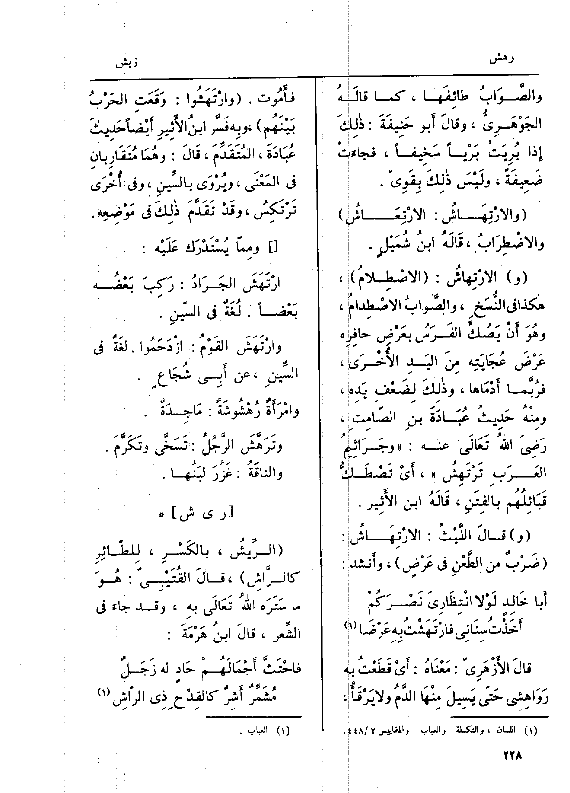 وارْتَهَشُوا: وَقَعَتِ الحَرْبُ بَيْنَهُم، وبِه فَسَّر ابنُ الأَثِيرِ أَيْضاً حَدِيثَ عُبَادَةَ، المُتَقَدِّمَ، قَالَ: وهُمَا مُتَقاَرِبانِ فِي المَعْنَى، ويُرْوَى بالسِّينِ، وَفِي أُخْرَى تَرْتَكِسُ، وقَدْ تَقَدَّمَ ذلِكَ فِي مَوْضِعِه. وممّا يُسْتَدْرَك عَلَيْه: ارْتَهَشَ الجَرَادُ: رَكِبَ بَعْضُه بَعْضاً. لُغَةٌ فِي السّينِ. وارْتَهَشَ القَوْمُ: ازْدَحَمُوا.