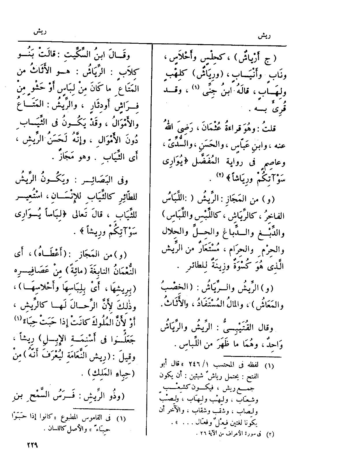 قلتُ: وهُوَ قراءَةُ عُثْمَانَ، رَضِيَ اللهُ عَنهُ، وابنِ عَبّاسٍ، والحَسَنِ، والسُّدِّيّ، وعاصِمٍ فِي رِوَايَة المُفَضَّل يُوَارِي سَوْآتِكُمْ {ورِيَاشاً. وَمن المَجَازِ: الرِّيشُ: اللِّبَاسُ الفاخِرُ،} كالرِّيَاشِ، كاللِّبْسِ واللِّبَاسِ والدِّبْغ والدِّباغ والحِلِّ والحِلال والحِرْمِ والحِرَام، مُسْتَعَارٌ من {الرِّيش الَّذِي هُوَ كُسْوَةٌ وزِينَةٌ لِلطائرِ. و} الرِّيشُ {والرِّيَاشُ: الخِصْبُ والمَعَاشُ، والمالُ المُسْتَفَادُ، والأَثَاثُ. وَقَالَ القُتَيْبِيُّ: الرِّيشُ والرِّيَاشُ وَاحِدٌ، وهُمَا مَا ظَهَرَ من اللِّباسِ. وقَالَ ابنُ السِّكِّيتِ: قالَتْ بَنُو كِلاَبٍ:} الرِّيَاشُ: هُوَ الأَثَاثُ من المَتَاعِ مَا كَانَ مِنْ لِبَاسٍ أَوْ حَشْوٍ مِنْ فِرَاشٍ أَو دِثَارٍ، {والرِّيشُ: المَتَاعُ والأَمْوَالُ، وقَدْ يَكُونُ فِي الثِّيَابِ دُونَ الأَمْوَالِ، وإِنَّهُ لَحَسَنُ الرِّيشِ، أَي الثِّيَابِ. وَهُوَ مَجَازٌ. وَفِي البَصَائِر: ويَكُونُ} الرِّيشُ للطّائِرِ كالثِّيَابِ للإِنْسَانِ، اسْتُعِير للثِّيَابِ، قالَ تَعالى لِبَاساً يُوَارِي سَوْآتِكُمْ {ورِيشاً.