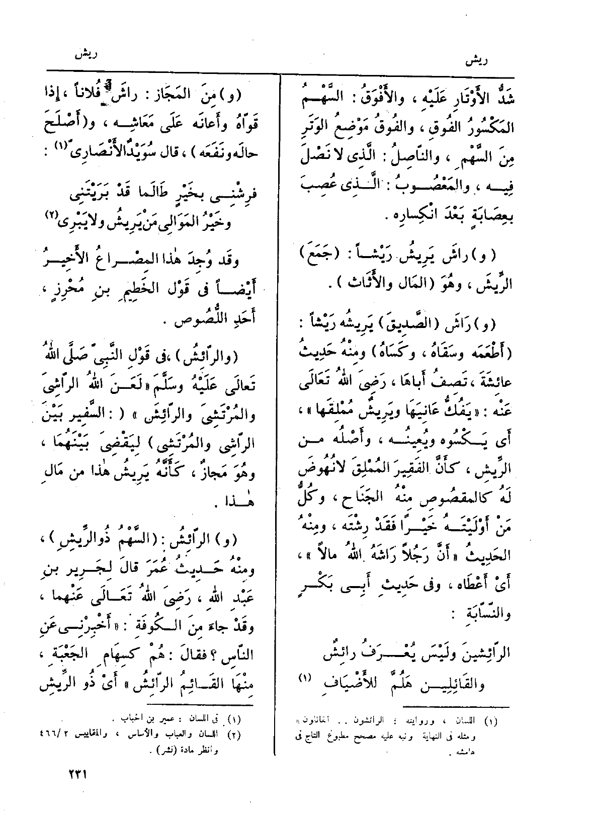 وقَد وُجِدَ هَذَا المِصْرَاعُ الأَخِيرُ أَيْضاً فِي قَوْل الخَطِيمِ بنِ مُحْرِزٍ، أَحَدِ اللُّصُوص. {والرّائِشُ، فِي قَوْلِ النَّبِيّ صَلَّى اللهُ تَعالَى عَلَيْهُ وسَلَّمَ لَعَنَ اللهُ الرّاشِيَ والمُرْتَشِيَ والرّائِشَ: السَّفِير بَيْنَ الرّاشِي والمُرْتَشِي لِيَقْضِيَ بَيْنَهُمَا، وهُوَ مَجازٌ، كَأَنَّهُ يَرِيشُ هَذَا من مَالِ هَذَا. والرّائِشُ: السَّهْمُ ذُو الرِّيِشِ، ومِنْهُ حَدِيثُ عُمَرَ قالَ لِجَرِيرِ بنِ عَبْدِ اللهِ، رَضِيَ اللهُ تَعَالَى عَنْهُما، وقَدْ جاءَ مِنَ الكُوفَةِ: أَخْبَرْنِي عَنِ النّاسِ فقالَ: هُمْ كسِهَامِ الجَعْبَةِ، مِنْهَا القَائِمُ الرّائِشُ أَيْ ذُو} الرِّيشِ