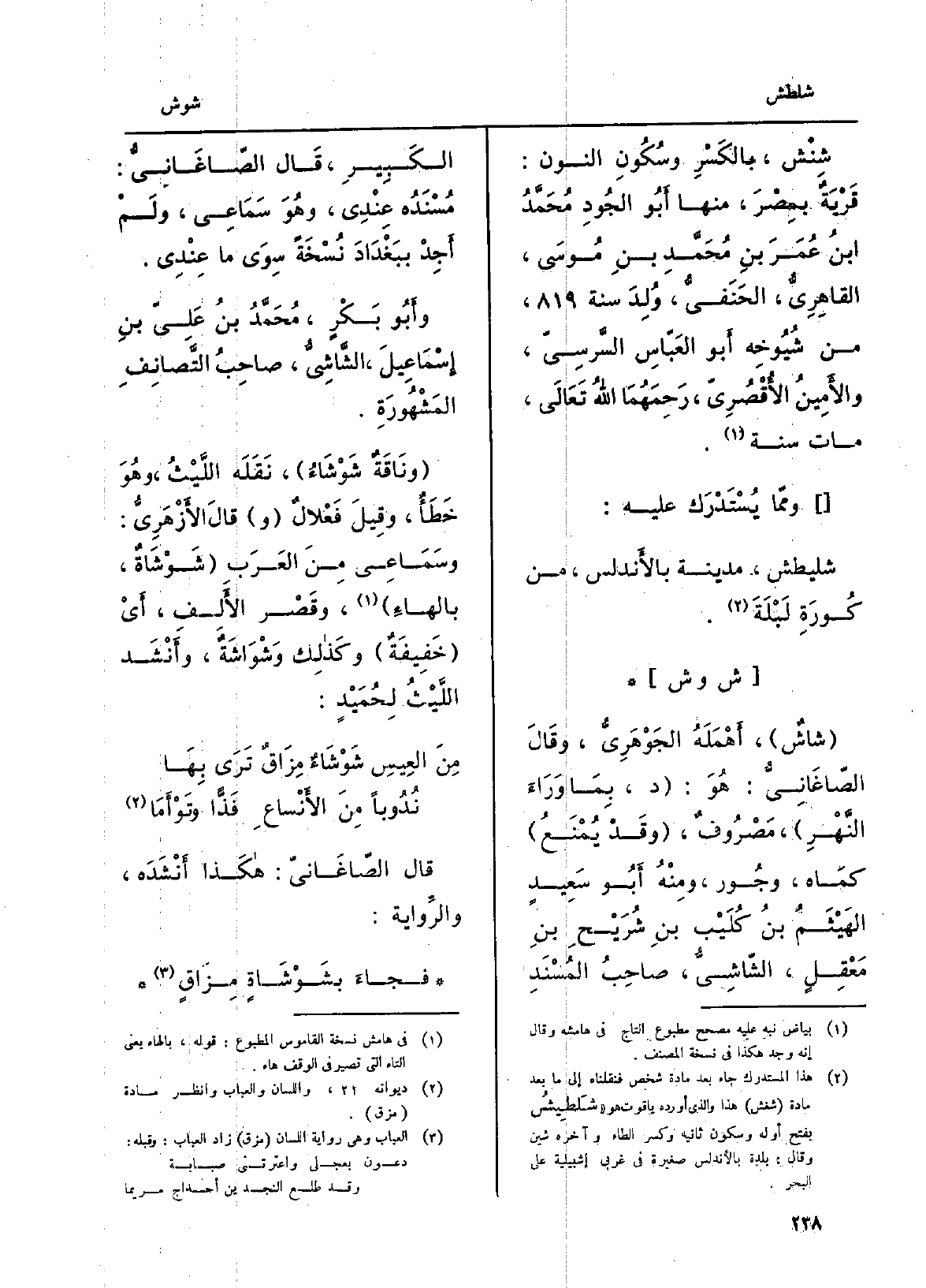 {شاشٌ، أَهْمَلَهُ الجَوْهَرِيُّ، وقَالَ الصّاغَانِيُّ: هُوَ: د، بِمَا وَرَاءَ النَّهْرِ، مَصْرُوفٌ، وقدْ يُمْنَعُ كمَاه، وجُور، ومِنْهُ أَبُو سَعِيدٍ الهَيْثَمُ بنُ كُلَيْب بنِ شُرَيْحِ بنِ مَعْقِلٍ،} - الشّاشِيُّ، صاحِبُ المُسْنَدِ الكَبِير، قَال الصّاغَانِيُّ: مُسْنَدُه عِنْدِي، وهُوَ سَمَاعِي، ولَمْ أَجِدْ ببَغْدَادَ نُسْخَةً سِوَى مَا عِنْدِي. وأَبُو بَكْرٍ، مُحَمَّدُ بنُ عَلِيّ بنِ إِسْمَاعِيلَ، الشَّاشِيُّ، صاحِبُ التَّصانِفِ المَشْهُورَةِ. ونَاقَةٌ {شَوْشَاءُ، نَقَلَه اللَّيْثُ، وهُوَ خَطَأُ، وقِيلَ فَعْلالٌ وقالَ الأَزْهَرِيُّ: وسَمَاعِيِ منَ العَرَبِ} شَوْشَاةٌ، بالهاءِ، وقَصْر الأَلِفِ، أَيْ خَفِيفَةٌ وكذَلِك {وَشْوَاشَةٌ، وأَنْشَد اللَّيْثُ لِحُمَيْدٍ: