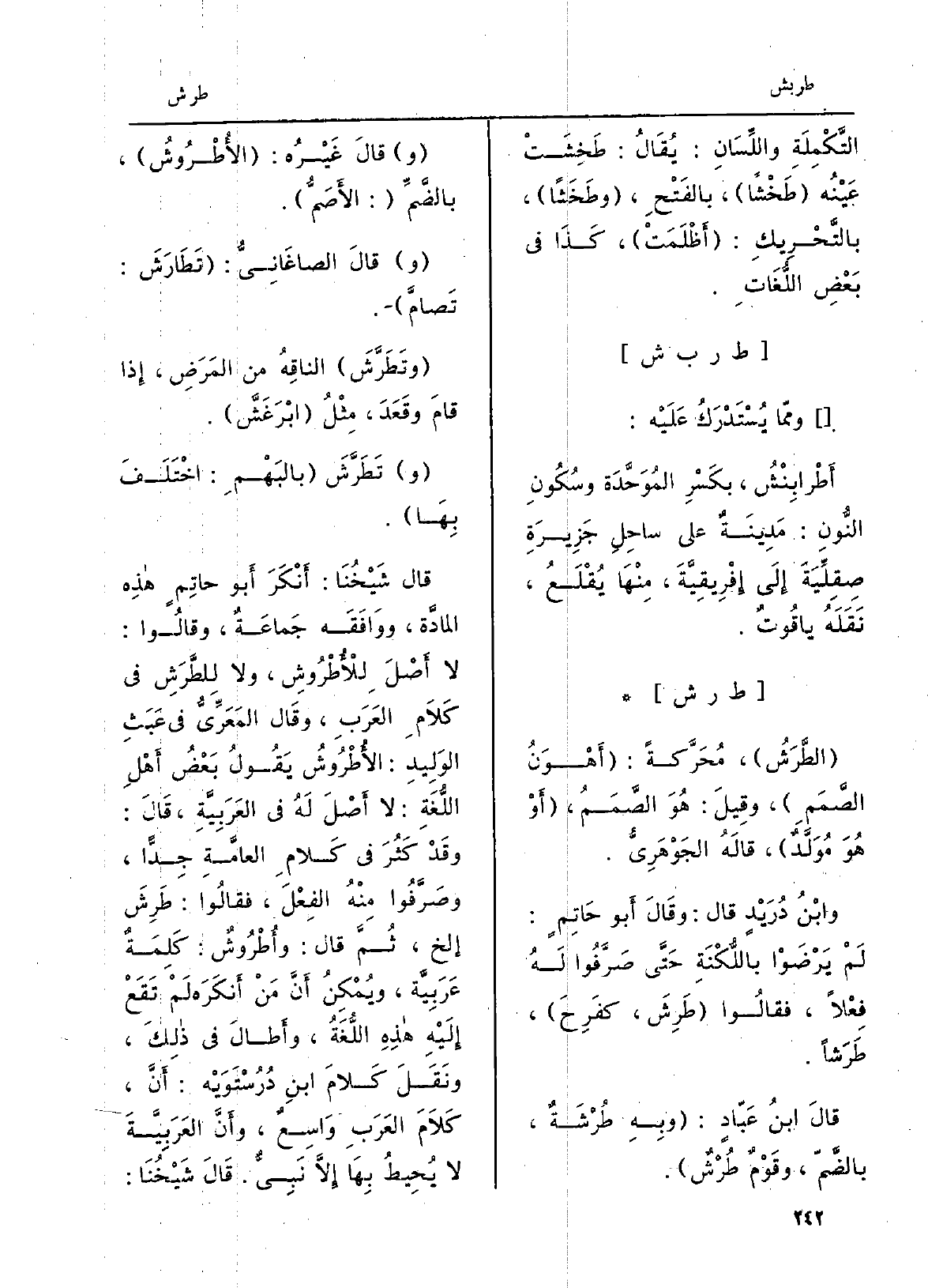 الطَّرَشُ، مُحَرَّكةً: أَهْوَنُ الصَّمَمِ، وقِيلَ: هُوَ الصَّمَمُ، أَوْ هُوَ مُوَلّدٌ، قَالَهُ الجَوْهَرِيُّ. وابْنُ دُرَيْدٍ قَالَ: وقَالَ أَبو حَاتِمٍ: لَمْ يَرْضَوْا باللُّكْنَةِ حتَّى صَرَّفُوا لَهُ فِعْلاً، فقالُوا طَرِشَ، كفَرِحَ، طَرَشاً. قالَ ابنُ عَبّادٍ: وبِهِ طُرْشَةٌ، بالضَّمّ، وقَوْمٌ طُرْشٌ. وقالَ غَيْرُه: الأُطْرُوشُ، بالضَّمِّ: الأَصَمُّ. وقالَ الصاغَانِيُّ: تَطَارَشَ: تَصامَّ. وتَطَرَّشَ الناقِهُ من المَرَضِ، إِذا قامَ وقَعدَ، مِثْلُ ابْرَغَشَّ. وتَطَرَّشَ بالبَهْمِ: اخْتَلَفَ بِهَا. قَالَ شَيْخُنَا: أَنْكَرَ أَبو حاتِمٍ هذِه المادَّة، ووَافَقَه جَماعَةٌ، وقالُوا: لَا أَصْلَ للأُطْرُوشِ، وَلَا لِلطَّرَشِ فِي كَلاَمِ العَرَبِ، وقَال المَعَرِّيُّ فِي عَبَثِ الوَلِيدِ: الأُطْرُوشُ يَقُولُ بَعْضُ أَهْلِ اللُّغَةِ: لَا أَصْلَ لَهُ فِي العَرَبِيَّةِ، قَالَ: وقَدْ كَثُرَ فِي كَلامِ العامَّةِ جِدّاً، وصَرَّفُوا مِنْهُ الِفْعَل، فقالُوا: طَرِشَ إِلخ، ثُمَّ قَالَ: وأُطْرُوشٌ: كَلِمَةٌ عَرَبِيَّة، ويُمْكِنُ أَنَّ مَنْ أَنكَرَه لَمْ تَقَعْ إِلَيْهِ هذِهِ اللُّغَةُ، وأَطالَ فِي ذلِكَ، ونَقَلَ كَلامَ ابنِ دُرُسْتَوَيْه: أَنَّ، كَلاَمَ العَرَبِ وَاسِعٌ، وأَنَّ العَرَبِيَّةَ لَا يُحِيطُ بِهَا إِلاَّ نَبِيٌّ. قَالَ شَيْخُنَا: