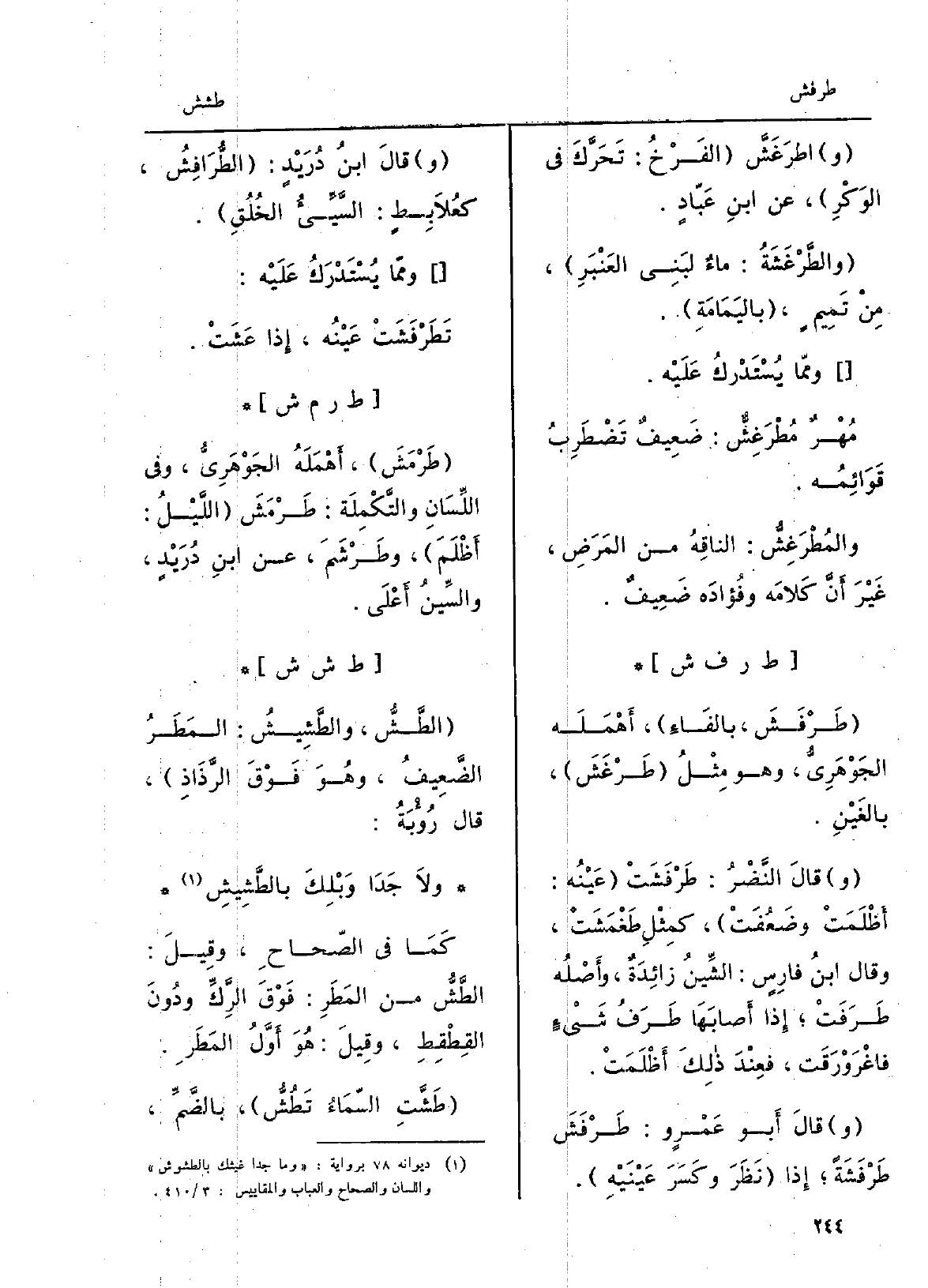 طَرْفَشَ، بالفَاءِ، أَهْمَلَه الجَوْهَرِيُّ وَهُوَ مِثْلُ طَرْغَشَ، بالغَيْنِ. وقالَ النَّضْرُ: طَرْفَشَتْ عَيْنُه: أَظْلَمَتْ وضَعُفَتْ، كمِثْلِ طَغْمَشَتْ، وَقَالَ ابنُ فارِسٍ: الشِّينُ زائِدَةٌ، وأَصْلُه طَرَفَتْ إِذا أَصابَهَا طَرَفُ شَيْءٍ فاغْرَوْرَقَت، فعِنْدَ ذلِكَ أَظْلَمَتْ. وقالَ أَبو عَمْرو: طَرْفَشَ طَرْفَشَةً إِذا نَظَرَ وكَسَرَ عَيْنَيْهِ. وقالَ ابنُ دُرَيْدٍ: الطُّرَافِشُ، كعُلاَبِطٍ: السَّيِّئُ الخُلُقِ. وممّا يُسْتَدْرَكُ عَلَيْه: تَطَرْفَشَتْ عَيْنُه، إِذا عَشَتْ.