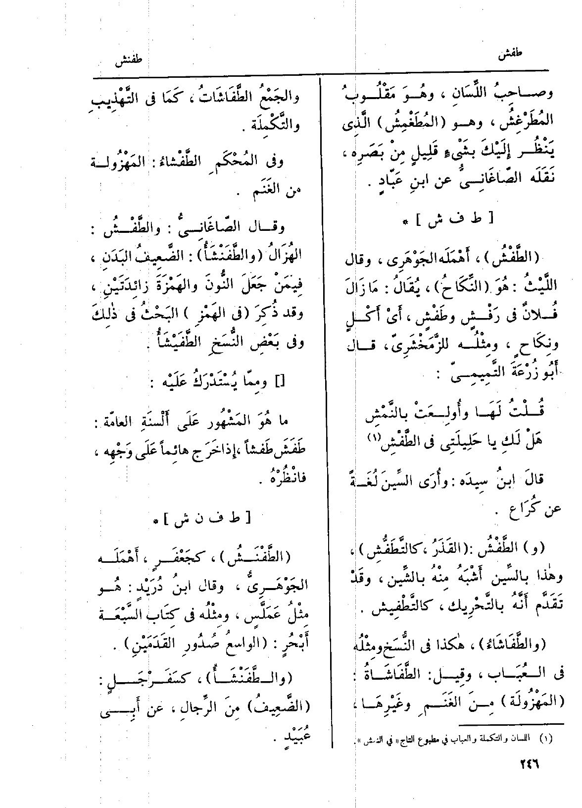 وَفِي المُحْكَمِ الطَّفْشاءُ: المَهْزُولة من الغَنَم. وَقَالَ الصّاغَانِيُّ: والطَّفْشُ: الهُزَالُ والطَّفَنْشَأُ: الضَّعِيفُ البَدَنِ، فِيمَنْ جَعَلَ النُّونَ والهَمْزَةَ زائِدَتَيْنِ، وَقد ذُكِرَ فِي الهَمْزِ البَحْثُ فِي ذلِكَ وَفِي بَعْضِ النُّسَخِ الطَّفَيْشَأُ. ومِمّا يُسْتَدْرَكُ عَلَيْه: مَا هُوَ المَشْهُور عَلَى أَلْسِنَةِ العامّة: طَفَشَ طَفشاً، إِذا خَرَج هائِماً عَلَى وَجْهِه، فانْظُرْهُ.