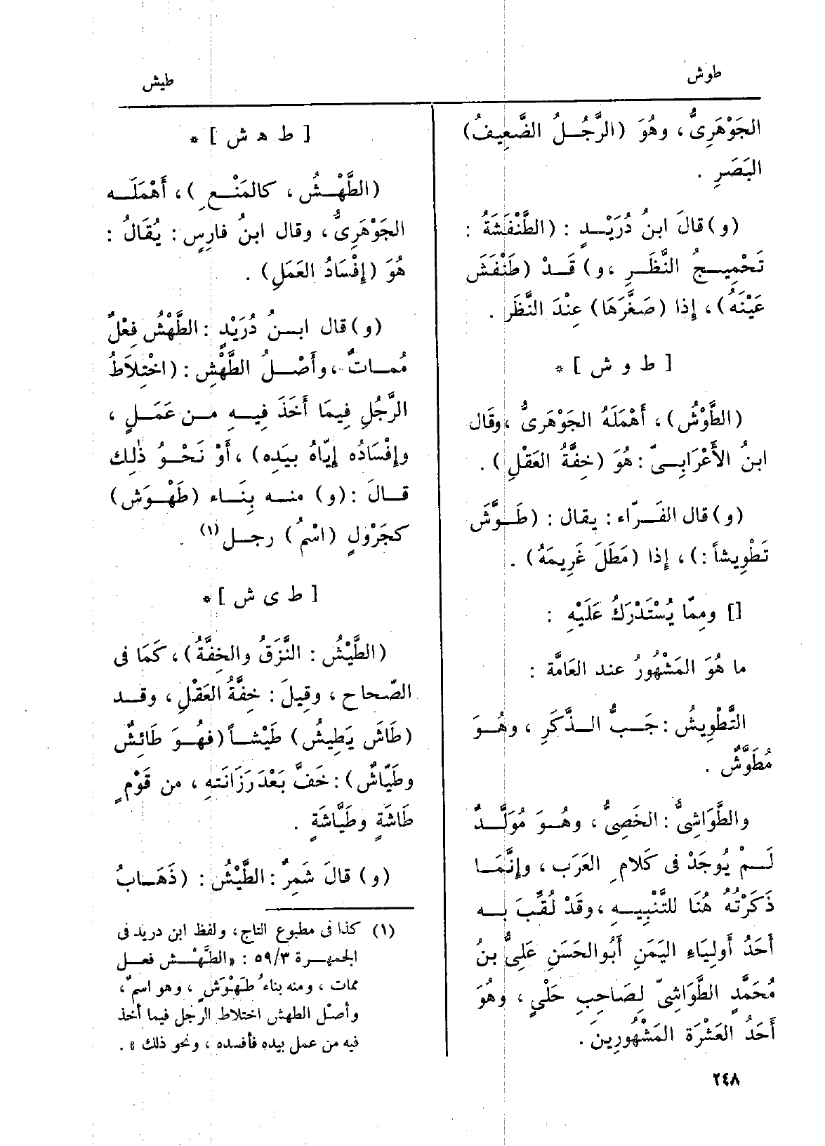 {الطَّوْشُ، أَهْمَلَهُ الجَوْهَرِيُّ، وقَال ابنُ الأَعْرَابِيّ: هُوَ خِفَّةُ العَقْلِ. وَقَالَ الفّرّاء: يُقَال:} طَوَّشَ {تَطْوِيشاً:، إِذا مَطَلَ غَرِيمَهُ. ومِمّا يُسْتَدْرَكُ عَلَيْه: مَا هُوَ المَشْهُورُ عِنْد العَامَّة:} التَّطْوِيشُ: جَبُّ الذَّكَرِ، وهُوَ {مُطَوَّشٌ.} والطَّوَاشِيُّ: الخَصِيُّ، وهُوَ مُوَلَّدٌ لَمْ يُوجَدْ فِي كَلامِ العَرَب، وإِنَّمَا ذَكَرْتُهُ هُنَا للتَّنْبِيهِ، وقَدْ لُقِّبَ بِهِ أَحَدُ أَوْلِيَاءِ اليَمَنِ أَبُو الحَسَنِ عَلِيُّ بنُ مُحَمَّدِ الطَّوَاشِيّ لِصَاحِبِ حَلْيٍ، وهُوَ أَحَدُ العَشْرَة المَشْهُورِينَ.