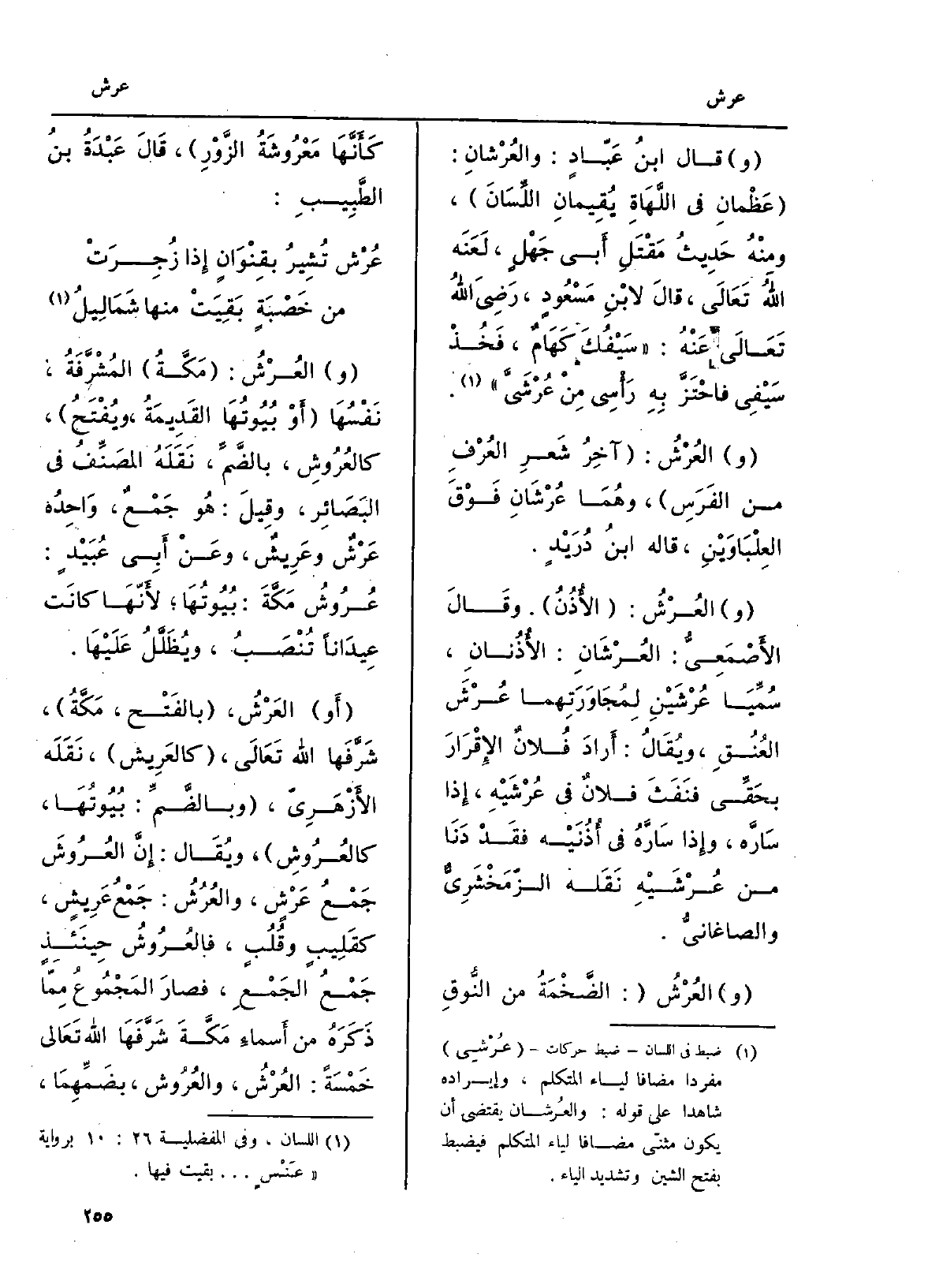 والعُرْشُ: مَكَّةُ المُشْرَّفَةُ، نَفْسُهَا أَوْ بُيُوتُهَا القَدِيمَةُ، ويُفْتَحُ، كالعُرُوشِ، بالضَّمِّ، نَقَلَه المصَنَّفُ فِي البَصَائِر، وقِيلَ: هُو جَمْعٌ، وَاحِدُه عَرْشٌ وعَرِيشٌ، وعَنْ أَبِي عُبَيْدٍ: عُرُوشُ مَكَّةَ: بُيُوتُهَا لأَنّهَا كانَت عِيدَاناً تُنْصَبُ، ويُظَلَّلُ عَلَيْهَا. أَو العَرْشُ، بالفَتْح، مَكَّةُ، شَرَّفَها الله تَعَالَى، كالعَرِيش، نَقَلَه الأَزْهَرِيّ، وبالضَّمِّ: بُيُوتُهَا، كالعُرُوشِ، ويُقَال: إِنَّ العُرُوشَ جَمْعُ عَرْشٍ، والعُرُشُ: جَمْعُ عَرْيشٍ، كقَلِيبٍ وقُلُبٍ، فالعُرُوشُ حِيَنئِذٍ جَمْعُ الجَمْعِ، فصارَ المَجْمُوعُ مِمّا ذَكَرَهُ من أَسماءِ مَكَّةَ شَرَّفَهَا الله تَعَالى خَمْسَةً: العُرْشُ، والعُرُوش، بضَمِّهِمَا،