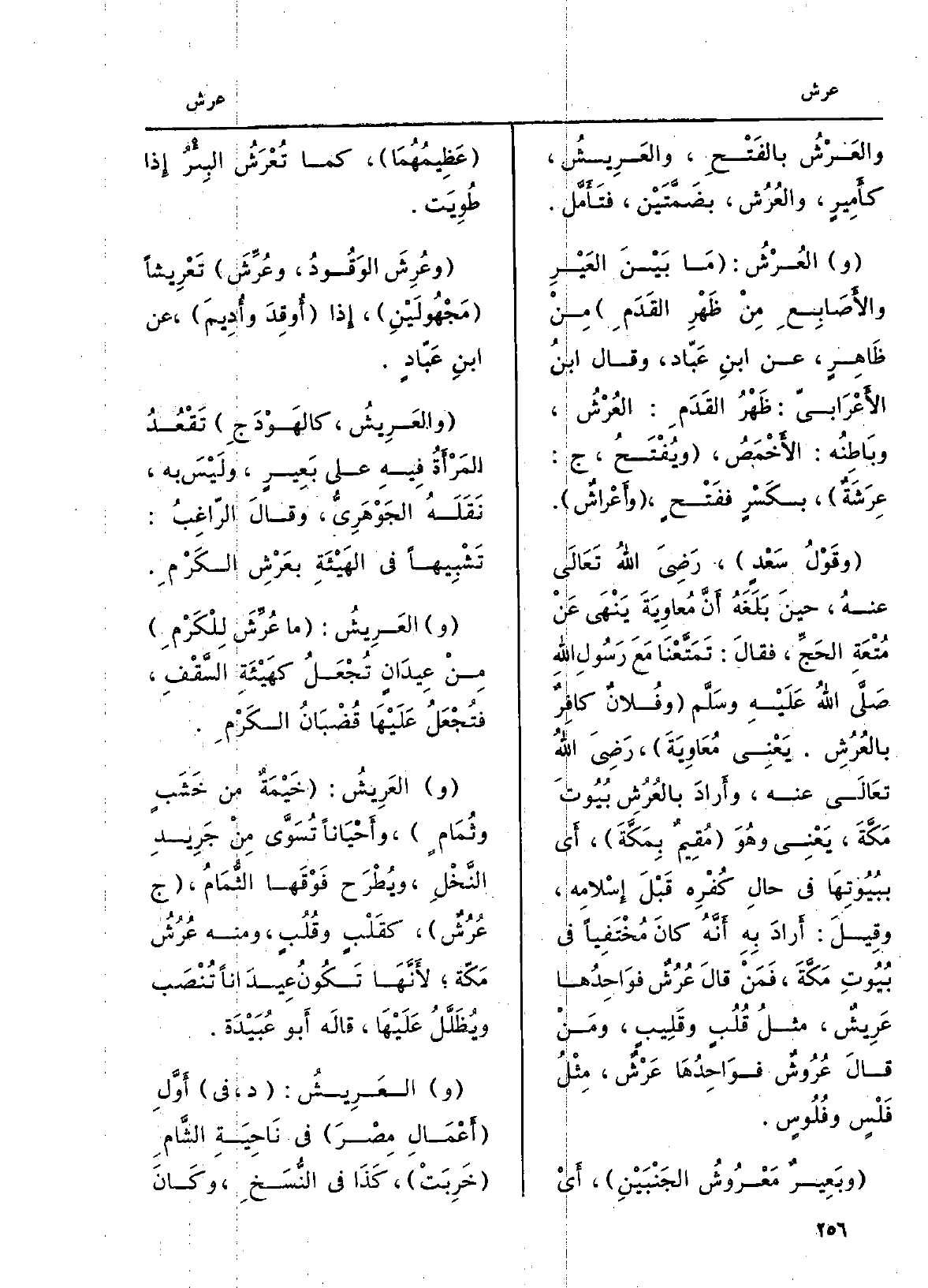 والعَرْشُ بالفَتْحِ، والعَرِيشُ، كأَمِيرٍ، والعُرُش، بضَمَّتَيْنِ، فَتَأَمَّل. والعُرْشُ: مَا بَيْنَ العَيْرِ والأَصَابِعِ مِنْ ظَهْرِ القَدَمِ مِنْ ظَاهِرٍ، عَن ابنِ عَبّاد، وَقَالَ ابنُ الأَعْرَابِيّ: ظَهْرُ القَدَمِ: العُرْشُ، وبَاطِنُه: الأَخْمَصُ، ويُفْتَحُ، ج: عِرْشَةٌ، بكَسْرٍ ففَتْحٍ، وأَعْراشٌ. وقَوْلٌ سَعْدٍ، رَضِيَ اللهُ تَعَالَى عنهُ، حينَ بَلَغَهُ أَنَّ مُعَاوِيَةَ يَنْهَي عَنْ مُتْعَةِ الحَجِّ، فقالَ: تَمَتَّعْنَا مَعَ رَسُولِ اللهِ صَلَّى اللهُ عَلَيْهِ وسَلَّم وفُلانٌ كافِرٌ بالعُرُشِ. يَعْنِي مُعَاوِيَةَ، رَضِيَ اللهُ تعَالَى عَنهُ، وأَرادَ بالعُرِشُ بُيُوتَ مَكَّةَ، يَعْنِي وهُوَ مُقِيمٌ بِمَكَّةَ، أَي ببيُوُتِهَا فِي حالِ كُفْرِه قَبْلَ إِسْلامِه، وقِيلَ: أَرادَ بِهِ أَنَّهُ كانَ مُخْتَفِياً فِي بُيُوتِ مَكَّةَ، فَمَنْ قالَ عُرُشٌ فوَاحِدُها عَرِيشٌ، مثلُ قُلُبٍ وقَلِيبٍ، ومَنْ قالَ عُرُوشٌ فوَاحِدُهَا عَرْشٌ، مِثْلُ فَلْسٍ وفُلُوسِ. وبَعِيرٌ مَعْرُوشُ الجَنْبَيْنِ، أَيْ عَظِيمُهُمَا، كَمَا تُعْرَشُ البِئْرُ إِذا طُوِيَت. وعُرِشَ الوَقُودُ، وعُرِّشَ تَعْرِيشاً مَجْهُولَيْنِ، إِذا أُوقِدَ وأُدِيمَ، عَن ابنِ عَبّادٍ. والعَرِيشُ، كالهَوْدَجِ تَقْعُدُ المَرْأَةُ فِيهِ على بَعِيرٍ، ولَيْسَ بِهِ، نَقَلَهُ الجَوْهَرِيُّ، وقالَ الرّاغِبُ: تَشْبِيهاً فِي الهَيْئَةِ بعَرْشِ الكَرْمِ. والعَرِيشُ: مَا عُرِّشَ لِلْكَرْمِ مِنْ عِيدَانٍ تُجْعَلُ كَهَيْئَةِ السَّقْفِ، فتُجْعَلُ عَلَيْهَا قُضْبَانُ الكَرْمِ. والعَرِيشُ: خَيْمَةٌ من خَشَبٍ وثُمَامٍ، وأَحْيَاناً تُسَوَّى مِنْ جَرِيدِ النَّخْلِ، ويُطْرَح فَوْقَها الثُّمَامُ، ج عُرُشٌ، كقَلْبٍ وقُلُبٍ، وَمِنْه عُرُشُ مَكَّة لأَنَّهَا تَكُونُ عِيدَاناً تُنْصَب ويُظَلَّلُ عَلَيْهَا، قالَه أَبو عُبَيْدَة. والعَرِيشُ: د، فِي أَوَّلِ أَعْمَالِ مِصْرَ فِي نَاحِيَةِ الشَّامِ خَرِبَتْ، كَذَا فِي النُّسَخِ، وكَان