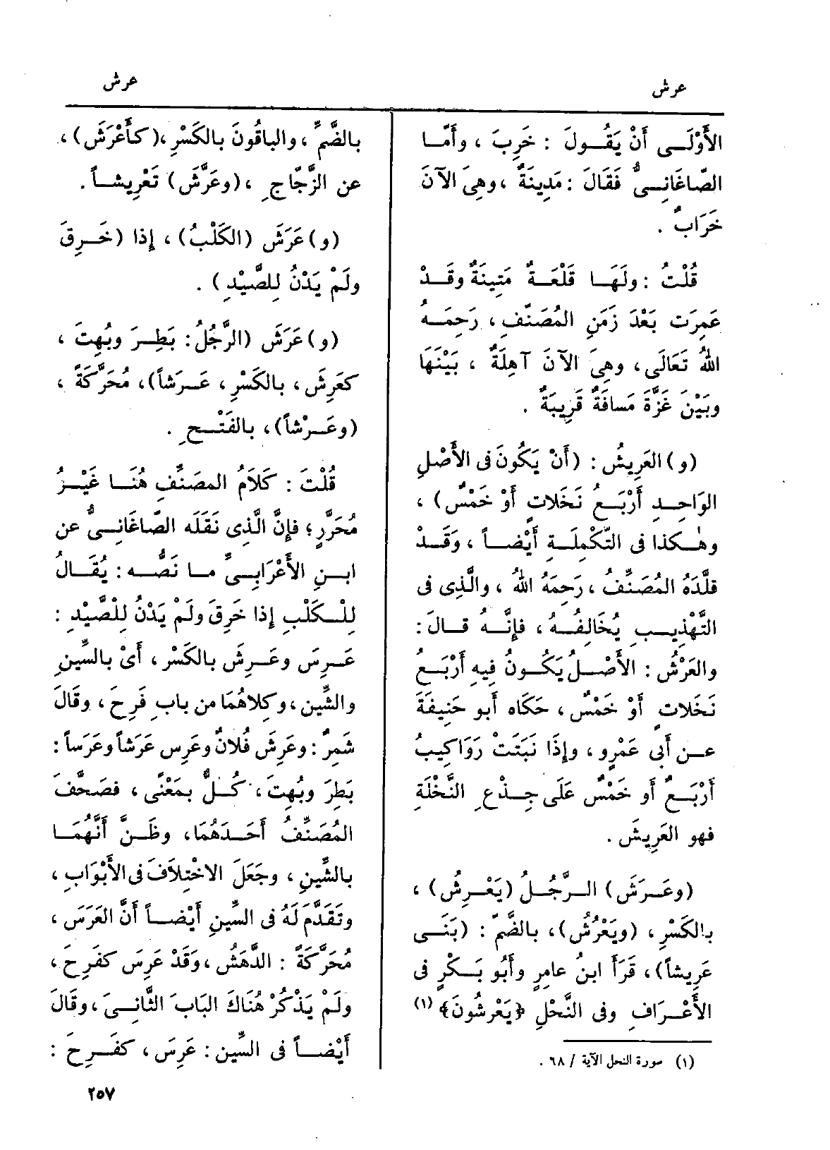 َ الأَوْلَى أَنْ يَقُولَ: خَرِبَ، وأَمّا الصّاغَانِيُّ فَقَالَ: مَدِينَةٌ، وهِيَ الآنَ خَرَابٌ. قُلْتُ: ولَهَا قَلْعَةٌ مَتِينَةٌ وقَدْ عَمِرَت بَعْدَ زَمَنِ المُصَنّفِ، رَحِمَهُ اللهُ تَعَالَى، وهِيَ الآنَ آهِلَةٌ، بَيْنَهَا وبَيْنَ غَزَّةَ مَسافَةٌ قَرِيبَةٌ. والعَرِيشُ: أَنْ يَكُونَ فِي الأَصْلِ الوَاحِدِ أَرْبَعُ نَخَلاتٍ أَوْ خَمْسٌ، وَهَكَذَا فِي التَّكْمِلَةِ أَيْضاً، وَقَدْ قَلَّدَهُ المُصَنِّفُ، رَحِمَهُ اللهُ، والَّذِي فِي التَّهْذِيبِ يُخَالِفُهُ، فإنَّهُ قالَ: والعَرْشُ: الأَصْلُ يَكُونُ فيهِ أَرْبَعُ نَخَلاتٍ أَوْ خَمْسٌ، حَكَاه أَبو حَنِيفَةَ عَن أَبي عَمْروٍ، وإذَا نَبَتَتْ رَوَاكِيبُ أَرْبَعٌ أَو خَمْسٌ عَلى جَذْعِ النَّخْلَةِ فَهُوَ العَرِيشَ.)
