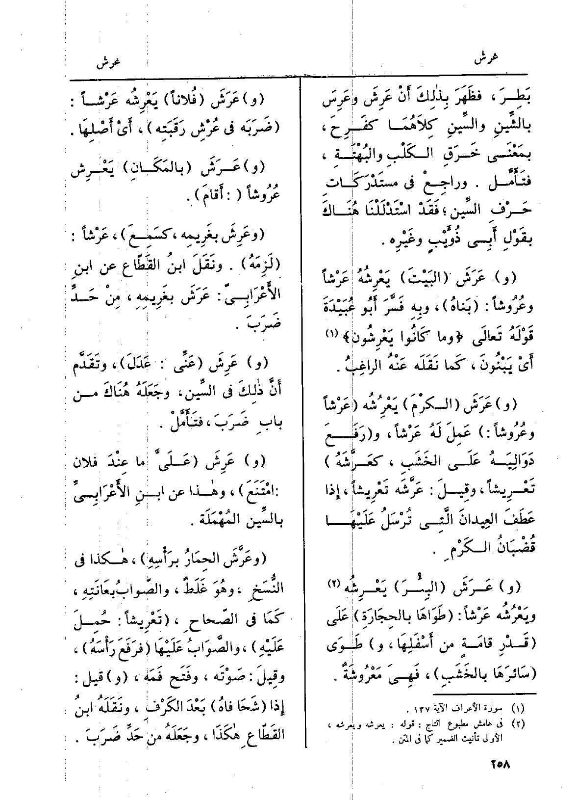 بَطِرَ، فظَهَر بِذلِكَ أَنْ عَرِشَ وعَرِسَ بالشِّينِ والسِّينِ كِلاَهُمَا كفَرِحَ، بمَعْنَى خَرَقِ الكَلْبِ والبُهْتَةِ، فتَأَمَّل. وراجِعْ فِي مستَدْرَكَاتِ حَرْفِ السِّين فَقَدْ اسْتَدْلَلْنَا هُنَاكَ بقَوْلِ أَبِي ذُؤَيْبٍ وغَيْرِه. وعَرَشَ البَيْتَ يَعْرِشُهُ عَرْشاً وعُرُوشاً: بَناهُ، وبِهِ فَسَّرَ أَبُو عُبَيْدَةَ قَوْلَهُ تَعالَى: وَمَا كَانُوا يَعْرِشُون. أَيْ يَبْنُونَ، كَما نَقَلَه عَنْهُ الراغِبُ. وعَرَشَ الكرْمَ يَعْرِشُهُ عَرْشاً وعُرُوشاً: عَمِلَ لَهُ عَرْشاً، ورَفَعَ دَوَالِيَهُ عَلَى الخَشَبِ، كعَرَّشَهُ تَعْرِيشاً، وقِيلَ: عَرَّشَه تَعْريِشاً، إِذا عَطَفَ العِيدانَ الَّتِي تُرْسَلُ عَلَيْهَا قُضْبَانُ الكَرْمِ. وعَرَشَ البِئْرَ يَعْرِشُه ويَعْرُشُه عَرْشاً: طَوَاهَا بالحِجَارَةِ عَلَى قَدْرِ قامَةٍ من أَسْفَلِهَا، وطَوَى سَائرَهَا بالخَشَبِ، فَهِيَ مَعْرُوشَةٌ. وعَرَشَ فُلاناً يَعْرِشُه عَرْشاً: ضَرَبَه فِي عُرْشِ رَقَبَتِه، أَيْ أَصْلِهَا. وعَرَشَ بالمَكَانِ يَعْرِش عُرُوشاً: أَقامَ. وعَرِشَ بغَرِيمِه، كسَمِعَ، عَرْشاً: لَزِمَهُ. ونَقَلَ ابنُ القَطّاع عَن ابنِ الأَعْرَابِيّ: عَرَشَ بغَرِيمِهِ، مِنْ حَدِّ ضَرَبَ. وعَرِشَ عَنِّي: عَدَلَ، وتَقَدَّم أَنَّ ذلِكَ فِي السِّين، وجَعَلَهُ هُنَاك من بابِ ضَرَبَ، فتَأَمَّلْ. وعَرِشَ عَلَىَّ مَا عِنْدَ فلَان: امتَنَعَ، وَهَذَا عَن ابنِ الأَعْرَابِيِّ بالسِّين المُهْمَلَة. وعَرَّشَ الحِمَارُ برَأسِهِ، هَكَذَا فِي النُّسَخِ، وهُوَ غَلَطٌ، والصّوابُ بعَانَتِهِ، كَمَا فِي الصّحاحِ، تَعْرِيشاً: حُمِلَ عَلَيْهِ، والصَّوَابُ عَلَيْهَا فرَفَعَ رَأْسَهُ، وقِيلَ: صَوْتَه، وفَتَح فَمَه، وَقيل: إِذا شَحَا فاهُ بَعْدَ الكَرْفِ، ونَقَلَهُ ابنُ القَطّاعِ هكَذَا، وجَعَلَهُ من حَدِّ ضَرَبَ.
