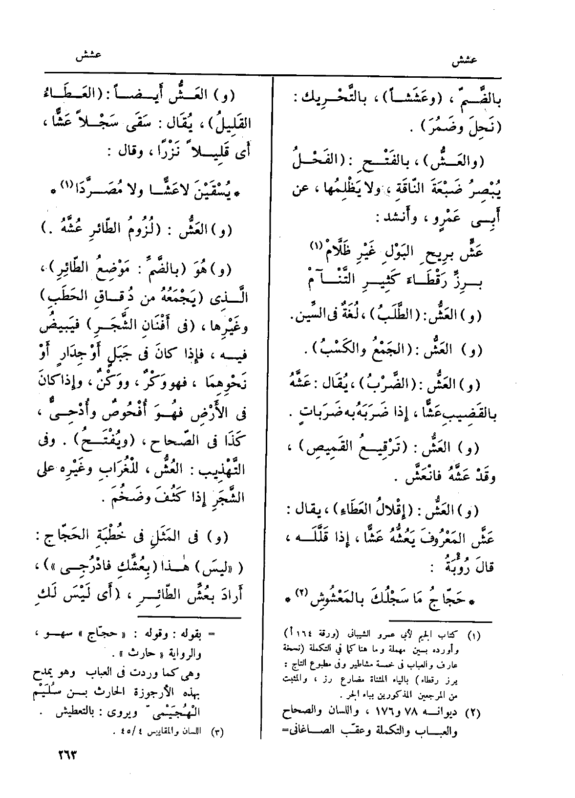 و} العَشُّ: الطَّلَبُ، لُغَةٌ فِي السِّين. و {العَشُّ: الجَمْعُ والكَسْبُ. والعَشُّ: الضَّرْبُ، يُقَال: عَشَّهُ بالقَضِيبِ عَشّاً، إِذا ضَرَبَهُ بِهِ ضَرَباتٍ. والعَشُّ: تَرْقِيعُ القَمِيصِ، وقَدْ عَشَّهُ فانْعَشّ. والعَشُّ: إِقْلالُ العَطَاءِ، يُقَال:} عَشَّ المَعْرُوفَ {يَعُشُّهُ} عَشّاً، إِذا قَلَّلَه، قالَ رُؤْبَةُ: حَجّاجُ مَا سَجْلُكَ {بالمَعْشُوشِ. و} العَشُّ أَيْضاً: العَطَاءُ القَلِيلُ، يُقَال: سَقَى سَجْلاً {عَشّاً، أَي قَلِيلاً نَزْراً، وَقَالَ: يُسْقَيْنَ لَا} عَشّاً وَلَا مُصَرَّدَا. و {العَشُّ: لُزُومُ الطّائرِ عُشَّهُ. وهُوَ بالضَّمِّ: مَوْضِعُ الطّائِرِ، الَّذِي يَجْمَعُهُ من دُقاقِ الحَطَبِ وغَيْرِها، فِي أَفْنَانِ الشَّجَرِ فيَبيضُ فِيه، فإِذا كانَ فِي جَبَلٍ أَوْ جِدَارٍ أَوْ نَحْوِهِمَا، فَهُوَ وَكْرٌ، ووَكْنٌ، وإِذا كانَ فِي الأَرْضِ فهُوَ أُفْحُوصٌ وأُدْحِىُّ، كَذَا فِي الصّحاح، ويُفْتَحُ. وَفِي التَّهْذِيب: العُشُّ، لِلْغُرَابِ وغَيْرِه على الشَّجَرِ إِذا كَثُفَ وضَخُمَ. وَفِي المَثَلِ فِي خُطْبَةِ الحَجّاج: ليسَ هَذَا} بعُشِّكِ فادْرُجِى، أَرادَ! بعُشِّ الطّائِرِ، أَي لَيْسَ لَك