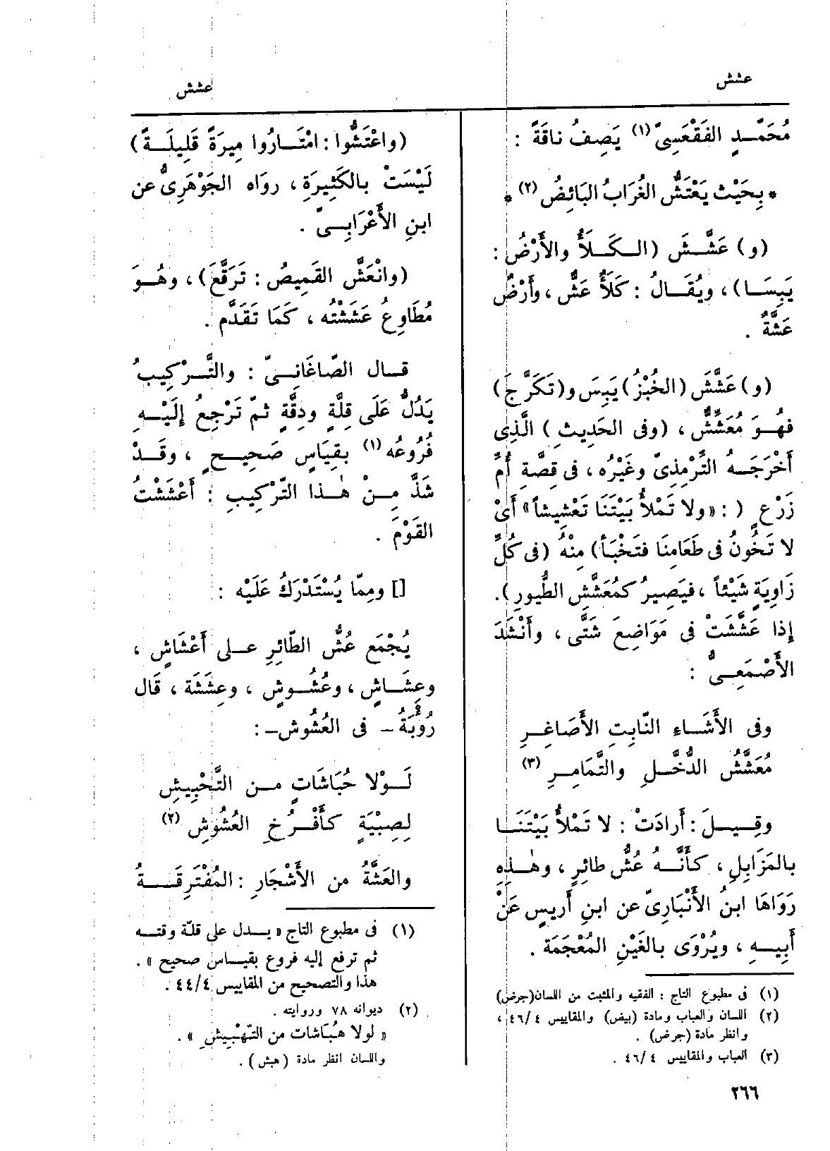 مُحَمّدٍ الفَقْعَسِيّ يَصِفُ ناقَةً: بِحَيْث {يَعْتَشُّ الغُرَابُ البَائِضُ. و} عَشَّشَ الكَلأُ والأَرْضُ: يَبْسَا، ويُقَالُ: كَلَأُ عَشٌّ، وأَرْضٌ عَشَّةٌ. و {عَشَّشَ الخُبْزُ يَبِسَ وتَكَرَّجَ فهُوَ} مُعَشِّشٌّ، وَفِي الحَدِيثِ الَّذِي أَخْرَجَهُ التِّرْمِذِيّ وغَيْرُه، فِي قِصَّةِ أُمِّ زَرْعٍ: وَلَا تَمْلأُ بَيْتَنَا {تَعْشِيشاً، أَيْ لَا تَخُونُ فِي طَعَامِنَا فتَخْبَأ مِنْهُ فِي كُلِّ زَاوِيَةٍ شَيْئاً، فيَصْيرُ} كمُعَشَّشِ الطُّيورِ. إِذا {عَشَّشَتْ فِي مَوَاضِعَ شَتَّى، وأَنْشَدَ الأَصْمَعِيُّ: