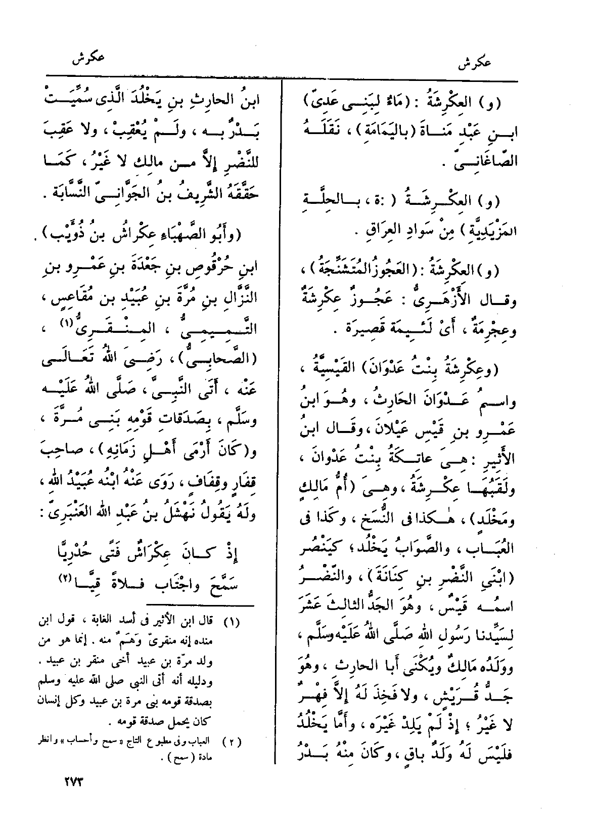 والعِكْرِشَةُ: مَاءٌ لِبَنِي عَدِيّ ابنِ عَبْدِ مَناةَ باليَمَامَةِ، نَقَلَهُ الصّاغَانِيّ. والعِكْرشَةُ: ة، بالحِلَّةِ المَزْيَدِيَّةِ مِنْ سَوادِ العِرَاقِ. والعِكْرِشَةُ: العَجُوزُ المُتَشَنِّجَةُ، وَقَالَ الأَزْهَرِيُّ: عَجُوزٌ عِكْرِشَةٌ وعِجْرِمَةٌ، أَيْ لَئِيمَة قَصِيرَة. وعِكْرِشَةُ بِنْتُ عَدْوَانَ القَيْسِيَّةُ، واسمُ عَدْوَانَ الحَارِثُ، وهُوَ ابنُ عَمْروِ بنِ قَيْسِ عَيْلانَ، وقَال ابنُ الأَثِيرِ: هِيَ عاتِكَةُ بِنْتُ عَدْوانَ، ولَقَبُهَا عِكْرِشَةُ، وهِيَ أُمُّ مَالِكٍ ومَخْلَدٍ، هَكَذَا فِي النُّسَخِ، وكَذا فِي العُبَاب، والصَّوَابُ يَخْلُد كيَنْصُر ابنْيَِالنَّضْرِ بنِ كِنَانَةَ، والنّضْرُ اسمُه قَيْسٌ، وهُوَ الجَدُّ الثالِثَ عَشَرَ لِسَيِّدنا رَسُولِ اللهِ صَلَّى اللهُ عَلَيْه وسَلَّم، ووَلَدُه مَالِكٌ ويُكْنَى أَبا الحارِثِ، وهُوَ جَدُّ قُرَيْشٍ، وَلَا فَخِذَ لَهُ إِلاَّ فِهْرٌ لَا غَيْرُ إِذْ لَمْ يَلِدْ غَيْرَه، وأَمَّا يَخْلُدُ فَلَيْسَ لَهُ وَلَدٌ باقٍ، وكَانَ مِنْهُ بَدْرُ ابنُ الحارِثِ بنِ يَخْلُدَ الَّذِي سُمِّيَتْ بَدْرٌ بِهِ، ولَمْ يُعْقِبْ، وَلَا عَقِبَ للنَّضْرِ إِلاَّ من مالِكِ لَا غَيْرُ، كَمَا حَقَّقَهُ الشَّرِيفُ بنُ الجَوَّانِيّ النَّسَّابَة. وأَبُو الصَّهْبَاءِ عِكْرَاشُ بنُ ذُؤَيْب ابنِ حُرْقُوصِ بنِ جَعْدَةَ بنِ عَمْروِ بنِ النَّزَّالِ بنِ مُرَّةَ بنِ عُبَيْدِ بن مُقَاعِسٍ، التَّمِيميُّ، المِنْقَرِيُّ، الصَّحابِيُّ، رَضِيَ اللهُ تَعالَى عَنْه، أَتَى النَّبِيَّ، صَلَّى اللهُ عَلَيْه وسَلَّم، بِصَدَقاتِ قَوْمِهِ بَنِي مُرَّةَ، وكَانَ أَرْمَى أَهْلِ زَمَانِهِ، صاحِبُ قِفَارٍ وقِفَافٍ، رَوَى عَنْهُ ابْنُه عُبَيْدُ اللهِ، ولَهُ يَقُولُ نَهْشَلُ بنُ عَبْدِ الله العَنْبَرِيّ:)