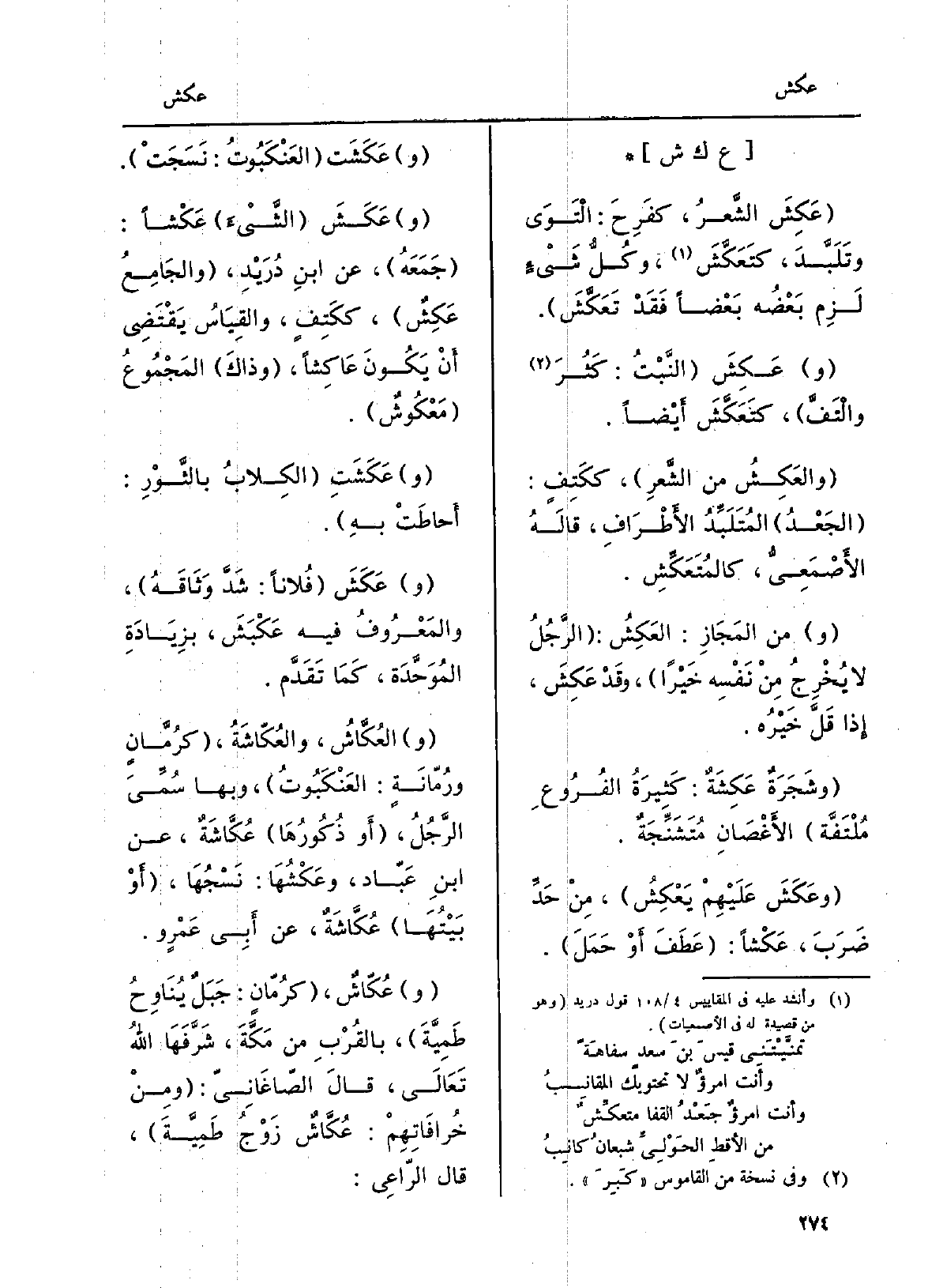 . عَكِشَ الشَّعرُ، كفَرِحَ: الْتَوَى وتَلَبَّدَ، كتَعَكَّشَ، وكُلُّ شَيْءٍ لَزِم بَعْضُه بَعْضاً فَقَدْ تَعَكَّشَ. وعَكِشَ النَّبْتُ: كَثُر والْتَفَّ، كتَعَكَّشَ أَيْضاً. والعَكِشُ من الشَّعرِ، ككَتِفٍ: الجَعْدُ المُتَلَبِّدُ الأَطْرَافِ، قالَهُ الأَصْمَعِيُّ، كالمُتَعَكِّشِ. وَمن المَجَازِ: العَكِشُ: الرَّجُلُ لَا يُخْرِجُ مِنْ نَفْسِه خَيْراً، وقَدْ عَكِشَ، إِذا قَلَّ خَيْرُه. وشَجَرَةٌ عَكِشةٌ: كَثِيرةُ الفُرُوعِ مُلْتَفَّة الأَغْصَانِ مُتَشَنِّجَةٌ. وعَكَشَ عَلَيْهِمْ يَعْكِشُ، مِنْ حَدِّ ضَرَبَ، عَكْشاً: عَطَفَ أَوْ حَمَلَ. وعَكَشَت العَنْكَبُوتُ: نَسَجَتْ. وعَكَشَ الشَّيْءَ عَكْشاً: جَمَعَهُ، عَن ابنِ دُرَيْد، والجَامِعُ عَكِشٌ، ككَتِفٍ، والقِيَاسُ يَقْتَضِي أَنْ يَكُونَ عَاكِشاً، وذاكَ المَجْمُوعُ مَعْكُوشٌ. وعَكَشَتِ الكِلابُ بالثَّوْرِ: أَحاطَتْ بهِ. وعَكَشَ فُلاناً: شَدَّ وَثَاقَهُ، والمَعْرُوفُ فِيهِ عَكْبَشَ، بزِيَادَةِ المُوَحَّدَة، كَمَا تَقَدَّم. والعُكَّاشُ، والعُكّاشَةُ، كرُمَّانٍ ورُمّانَةٍ: العَنْكَبُوتُ، وَبهَا سُمِّيَ الرَّجُلُ، أَو ذُكُورُهَا عُكَّاشَةٌ، عَن ابنِ عَبّاد، وعَكْشُهَا: نَسْجُهَا، أَوْ بَيْتُهَا عُكَّاشَةُ، عَن أَبِي عَمْروٍ.