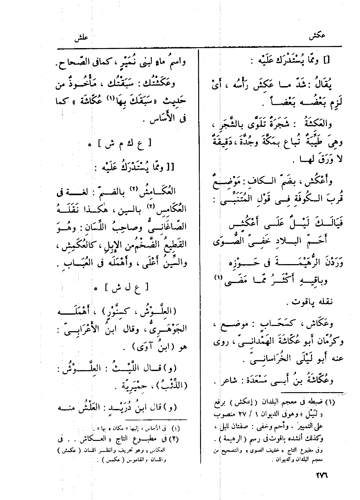 نَقله ياقوت. وعَكَاش، كسَحَابٍ: مَوضِع، وكرُمّان أَبو عُكّاشَةَ الهَمْدانِيّ، روى عَنهُ أَبو لَيْلَى الخُرَاسانِيّ. وعُكّاشَةُ بنُ أَبي مَسْعَدَة: شَاعِر واسمُ ماءٍ لبني نُمَيْرٍ، كَمَا فِي الصّحاح. وعَكَشْتُك: سَبَقْتُك، مَأْخُوذٌ من حَدِيث سَبَقَكَ بِهَا عُكّاشَة كَمَا فِي الأَسَاس.