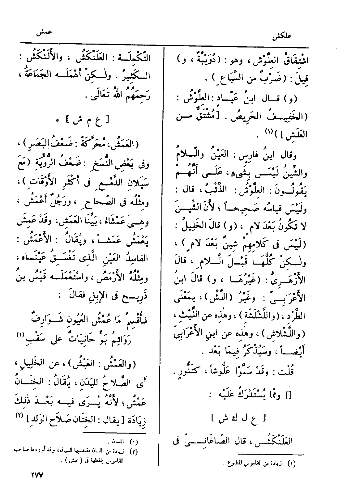 اشْتِقَاقُ العِلَّوْش، وَهُوَ دُوَيْبَةٌ، وقِيلَ: ضَرْبٌ من السِّبَاعِ. وَقَالَ ابنُ عَبّادٍ: العِلَّوْشُ: الخَفِيفُ الحَرِيصُ. مُشْتَقٌّ من العَلَشِ. وَقَالَ ابنُ فارِسٍ: العَيْنُ والّلامُ والشِّينُ لَيْسَ بِشَيءٍ، عَلَى أَنَّهُمْ يَقُولُونَ: العِلَّوْشُ: الذِّئْبُ، قَالَ: ولَيْسَ قياسُه صَحِيحاً لأَنَّ الشِّينَ لَا تَكُونُ بَعْدَ لامٍ، وقالَ الخَلِيلُ: لَيْسَ فِي كَلامِهِمْ شِيْنٌ بَعْدَ لامٍ، ولكِنْ كُلُّهَا قَبْلَ الَّلامِ، قالَ الأَزْهَرِيُّ: غَيْرُهَا، وقالَ ابنُ الأَعْرَابِيّ: وغَيْرُ اللَّشِّ، بمَعْنَى الطَّرْدِ، واللَّشْلَشَةِ، وهذِه عَن اللَّيْثِ، واللَّشْلاشِ، وهذِه عَن ابنِ الأَعْرَابِيّ أَيْضاً، وسَيُذْكَرُ فِيمَا بَعْد. قُلْت: وقَدْ سَمُّوْا عَلُّوشاً، كتَنُّورٍ.