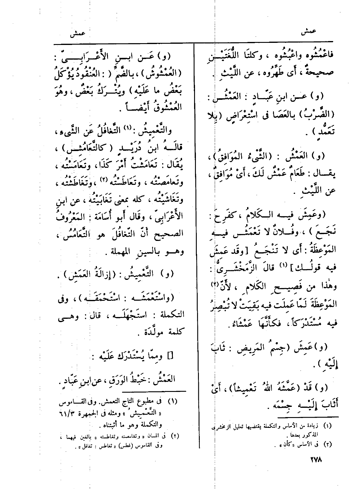 ِ فاعْمُشُوه واعْبُشُوه، وكلتَا اللُّغَتَيْنِ صحيحةٌ، أَي طَهِّرُوه، عَن اللَّيْثِ. وَعَن ابنِ عَبّادٍ: العَمْشُ: الضَّرْبُ بالعَصَا فِي اسْتِعْرَاضٍ بِلا تَعَمُّدٍ. والعَمَشُ: الشَّيْءُ المُوَافِقُ، يُقالُ طَعَامٌ عَمْشٌ لَكَ، أَيْ مُوافِقٌ عَن اللَّيْثِ. وعَمِشَ فِيهِ الكَلامُ، كفَرِحَ: نَجَعَ، وفُلانٌ لَا تَعْمَشُ فيهِ المَوْعِظَةُ: أَي لَا تَنْجَعُ وقَد عَمِشَ فِيهِ قولُك قالَ الزَّمَخْشَرِيُّ: وَهَذَا من فَصِيحِ الكَلامِ، لأَنّ المَوْعِظَةَ لَمّا عَمِلَت فِيهِ بَقِيَتْ لَا تُبْصِرُ فِيهِ مُسْتَدْرَكاً، فكأَنَّهَا عَمْشَاءُ. وعَمِشَ جِسْمُ المَرِيضِ: ثَابَ إِلَيْهِ. وقَدْ عَمَّشَهُ اللهُ تَعْمِيشاً، أَيْ أَثَابَ إِلَيْهِ جِسْمَه. وعَن ابنِ الأَعْرَابِيّ: العُمْشُوشُ، بالضَّمِّ: العُنْقُودُ يُؤْكَلُ بَعْضُ مَا عَلَيْهِ ويُتْرَكُ بَعْضٌ، وهُوَ العُمْشُوقُ أَيْضاً.