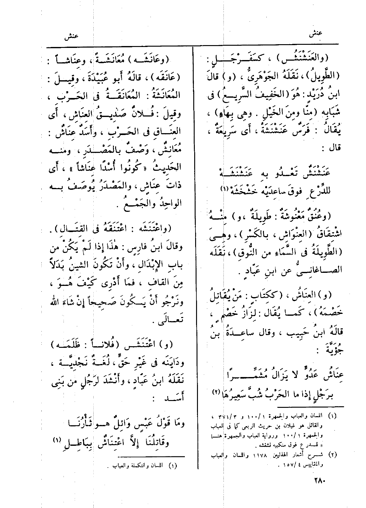 وعَانَشَه مُعَانَشَةً، وعِنَاشاً: عَانَقَه، قالَهُ أَبو عُبَيْدَةَ، وقِيلَ: المُعَانَشَةُ: المُعَانَقَةُ فِي الحَرْبِ، وقِيلَ: فُلانٌ صَدِيقُ العِنَاشِ، أَي العِنَاقِ فِي الحَرْبِ، وأَسَد عِنَاشٌ: مُعَانَشٌ، وَصْفٌ بالمَصْدَرِ، وَمِنْه الحَدِيثُ كُونُوا أُسْدَاً عِنَاشاً، أَي ذاتَ عِنَاشٍ، والمَصْدَرُ يُوْصَفُ بِهِ الواحِدُ والجَمْعُ. واعْتَنَشَه: اعْتَنَقَهُ فِي القِتَالِ. وقالَ ابنُ فارِسٍ: هذَا إِذا لَمْ يَكُنْ من بابِ الإِبْدَالِ، وأَنْ تَكُونَ الشينُ بَدَلاً مِنَ القافِ، فمَا أَدْرِي كَيْفَ هُوَ، ونَرْجُو أَنْ يَكُونَ صَحِيحاً إِنْ شَاءَ الله تَعالَى. واعْتَنَشَ فُلاناً: ظَلَمَه ودَايَنَه فِي غَيْرِ حَقٍّ، لُغَةٌ نَجْدِيَّة، نَقَلَهُ ابنُ عَبّادٍ، وأَنْشَدَ لرَجُلٍ من بَنِي أَسَد:)