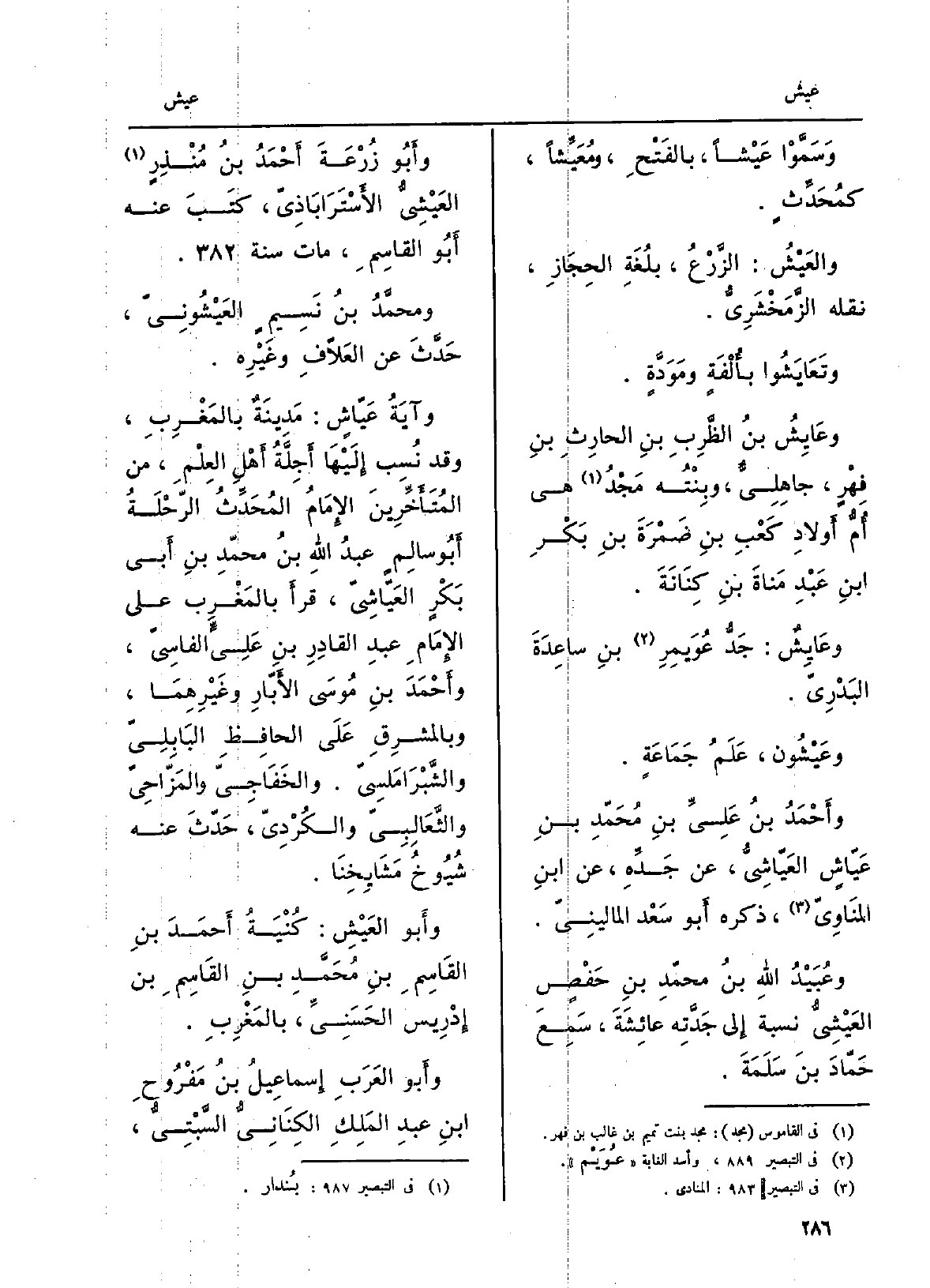 وَسَمَّوا {عَيْشاً، بالفَتْحِ،} ومُعَيِّشاً، كمُحَدِّثٍ. {والعَيْشُ: الزَّرْعُ، بلُغَةِ الحجَازِ، نَقله الزَّمَخْشَرِيُّ.} وتَعَايَشُوا بأُلْفَةٍ ومَوَدَّةٍ. {وعَايِشُ بنُ الظَّرِبِ بنِ الحارِثِ بنِ فِهْرٍ، جاهِلِيٌّ، وبِنْتُه مَجْدُ هِيَ أُمُّ أَولادِ كَعْبِ بنِ ضَمْرَةَ بنِ بَكْرِ ابنِ عَبْدِ مَناةَ بنِ كِنَانَةَ. وعَايِشٌ: جَدُّ عُوَيمِرِ بنِ ساعِدَةَ البَدْرِيّ.} وعَيْشُون، عَلَمُ جَمَاعَة. وأَحْمَدُ بنُ عَلِيِّ بنِ مُحَمّدِ بنِ عَيّاشٍ العَيّاشِيُّ، عَن جَدِّهِ، عَن ابنِ المنَاوِيّ، ذكره أَبو سَعْد المالينِيّ. وعُبَيْدُ اللهِ بنُ محمّدِ بنِ حَفْصِ {- العَيْشِيُّ نِسْبَة إِلى جَدَّتِه عائِشَةَ، سَمِعَ حَمّادَ بنَ سَلَمةَ. وأَبُو زُرْعَةَ أَحْمَدُ بنُ مُنْذِرٍ العَيْشِيُّ الأَسْتَرَابَاذِيّ، كَتبَ عَنهُ أَبُو القاسِمِ، مَاتَ سنة. ومحمَّدُ بنُ نَسِيمٍ} العَيْشُونِيّ، حَدَّثَ عَن العَلاّفِ وغَيْرِه. وآيَةُ {عَيّاشِ: مَدِينَةٌ بالمَغْرِبِ، وَقد نُسِب إِلَيْهَا أَجِلَّةُ أَهْلِ العِلْمِ، من المُتَأَخِّرِينَ الإِمَامُ المُحَدِّثُ الرّحْلَةُ أَبُو سالِمٍ عبدُ اللهِ بنُ محمّدِ بنِ أَبي بَكْرٍ} - العَيّاشِيّ، قَرأَ بالمَغْرِب على الإِمَامِ عبدِ القادِرِ بنِ عَلِيٍّ الفاسِيّ، وأَحْمَدَ بنِ مُوسَى الأَبّارِ وغَيْرِهِمَا، وبالمشرِقِ عَلَي الحافِظِ البَابلِيّ والشَّبْرَامَلسِيّ، والخَفَاجِيّ والمَزّاحِيّ والثَّعَالِبِيّ والكُرْدِيّ، حَدّثَ عَنهُ شُيُوخُ مَشَايِخنَا. وأَبو! العَيْشِ: كُنْيَةُ أَحْمَدَ بنِ القَاسِمِ بنِ مُحَمَّدِ بنِ القَاسِمِ بن إِدْرِيس الحَسَنِيِّ، بالمَغْرِبِ.