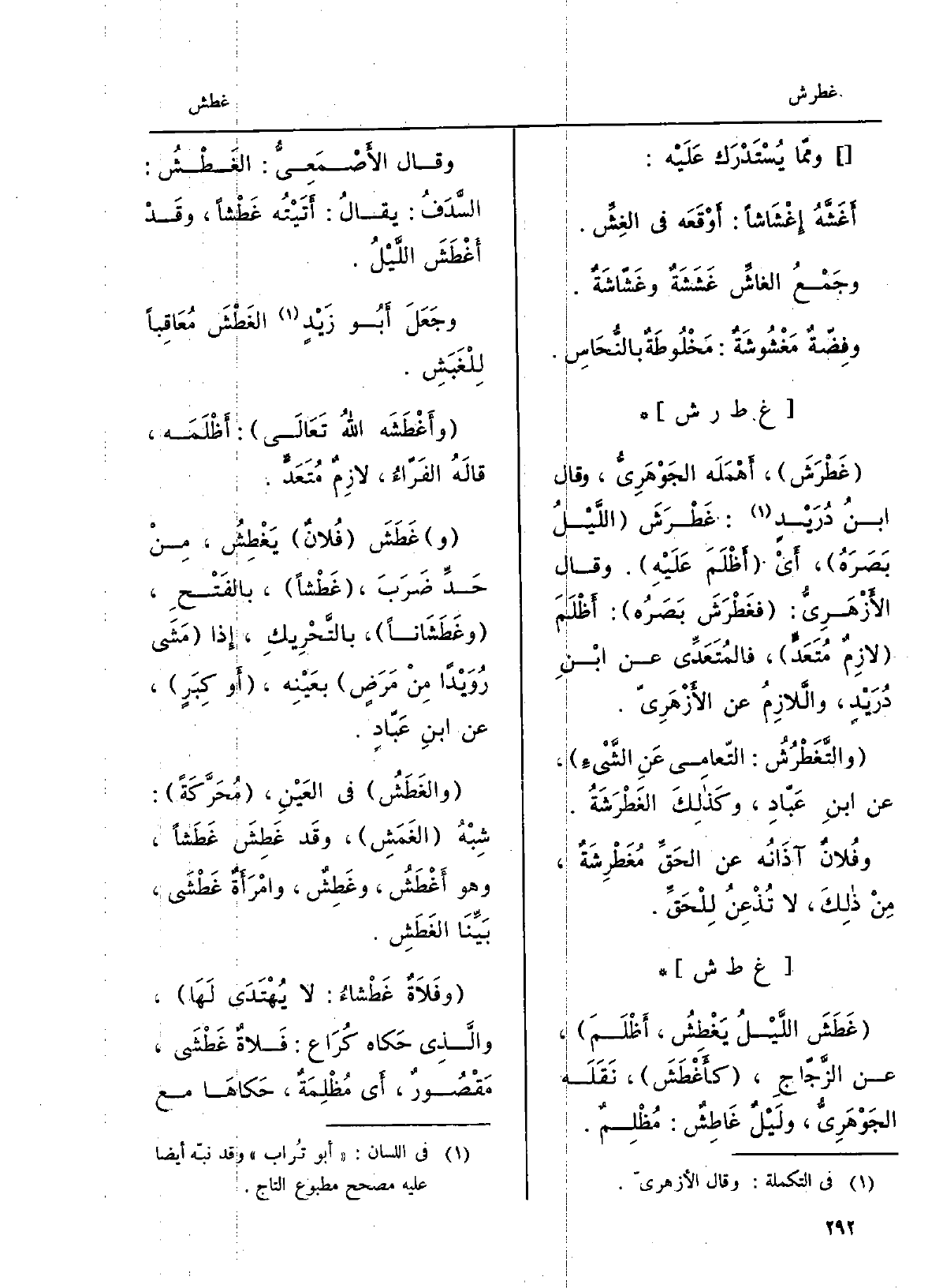 (غَطْرَشَ) ، أَهْمَلَه الجَوْهَرِىُّ، وَقَالَ ابنُ دُرَيْدٍ: غَطْرَشَ (اللَّيْلُ بَصَرَهُ) ، أَىْ (أَظْلَمَ عَلَيْهِ) . وَقَالَ الأَزْهَرِىُّ: (فغَطْرَشَ بَصَرُه) : أَظْلَمَ (لازِمٌ مُتَعَدٍّ) ، فالمُتَعَدى عَن ابْنِ دُرَيْدٍ، والَّلازِمُ عَن الأَزْهَرِىّ. (والتَّغَطْرُشُ: التّعامِى عَنِ الشَّىْءِ) ، عَن ابنِ عَبّادِ، وكَذلِكَ الغَطْرَشَةُ. وفُلانٌ آذَانُه عَن الحَقِّ مُغَطْرِشَةٌ، مِنْ ذلِكَ، لَا تُذْعِنُ لِلْحَقِّ.