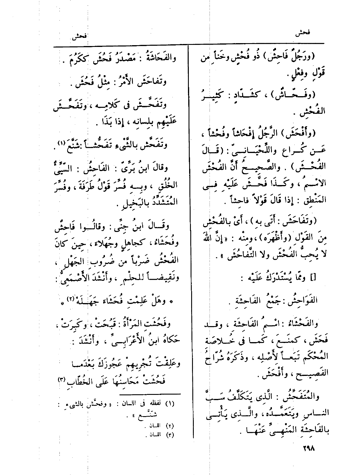 (ورَجُلٌ فَاحِشٌ) ذُو فُحْشٍ وخَناً مِن قَوْلٍ وفِعْلٍ. (وفَحّاشٌ) ، كشَدّادٍ: كَثِيرُ الفُحْشِ. (وأَفْحَشَ) الرَّجُلُ إِفْحَاشاً وفُحْشاً، عَن كُراع واللِّحْيَانِيّ: (قَالَ الفُحْشَ) . والصَّحِيحُ أنَّ الفُحْشَ الاسْمُ، وكَذَا فَحَّشَ عَلَيْهِ فِى المَنْطِق: إِذا قَالَ قَوْلاً فاحِشاً. (وتَفَاحَشَ: أَتَى بهِ) ، أَىْ بالفُحْشِ مِنَ القَوْلِ (وأَظْهَرَه) ، ومِنْه: " إِنَّ اللَه لَا يُحِبُّ الفُحْشَ وَلَا التَّفاحُشَ ". [] ومّما يُسْتَدْرَكُ عَلَيْه: الفَوَاحِشُ: جَمْعُ الفَاحِشَةِ. والفَحْشَاءُ: اسْمُ الفاحِشَةِ، وَقد فَحَشَ، كمَنعَ، كَما فِي خُلاصَةِ المُحْكَم تَبَعاً لأَصْلهِ، وذَكَرَهُ شُرّاحُ الفَصِيح، وأَفْحَشَ. والمُتَفَحِّشُ: الَّذِي يَتَكَلَّفُ سَبَّ الناسِ ويَتَعَّمُده، والَّذِي يَأْتِى بالفَاحِشَةِ المَنْهِىِّ عَنْهَا. والفَحَاشَةُ: مَصْدَرُ فَحُشَ ككَرُمَ. وتَفاحَشَ الأَمْرُ: مِثْلُ فَحُشَ. وتَفَحَّشَ فِي كَلامِه، وتَفَحَّشَ عَلَيْهِم بلِسانِه، إِذا بَذَا. وتَفَحَّش بالشَّيْءِ تَفَحُّشاً شَنَّعَ. وقالَ ابْن بَرِّىّ: الفَاحِشُ: السّيِّىءٌ الخُلُقِ، وبِهِ فُسِّرَ قَوْلُ طَرَفَةَ، وفُسِّرَ المُتَشَدَّدُ بالبَخِيلِ. وقَالَ ابْن جِنِّى: وقالُوا فَاحِشٌ وفُحشاءُ، كجاهِلٍ وجُهَلاءَ، حِينَ كَانَ الفُحْشُ ضَرْباً من ضُرُوبِ الجَهْلِ، ونَقِيضاً للحِلْمِ، وأَنْشَدَ الأَصْمَعِى:
