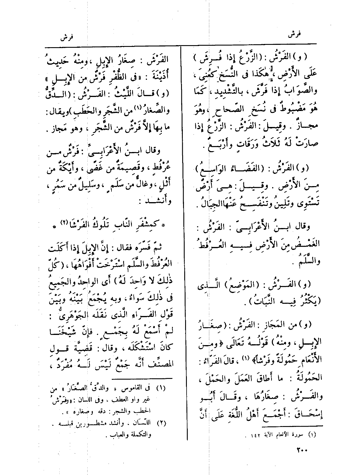 (و) الفَرْشُ: (الزَّرْعُ إِذا فُرِشَ) عَلَى الأَرْضِ، هكَذا فِي النُّسَخ كعُنِىَ، والصَّوَابُ إِذا فَرَّشَ، بالتَّشْدِيدِ، كَمَا هُوَ مَضْبُوطٌ فِي نُسَخِ الصّحاحِ، وهُوَ مجازٌ. وقِيلَ: الفَرْشُ: الزَّرْعُ إِذا صارَتْ لَهُ ثَلاَثُ وَرَقَاتٍ وأَرْبَعٌ. (و) الفَرْشُ: (الفَضَاءُ الوَاسِعُ) من الأَرْضِ. وِقيلَ هِىَ أَرْضٌ تَسْتَوِى وتَلِينُ وتَنْفَسِحُ عَنْهَا الجِبَالُ. وَقَالَ ابنُ الأَعْرَابِىّ: الفَرْشُ: الغَمْضُ من الأَرْضِ فِيهِ العُرْفُطُ والسَّلَمُ. (و) الفَرْشُ: (المَوْضِعُ) الَّذِى (يَكْثُرُ فِيه النَّبَاتُ) . (و) من المَجَازِ: الفَرْشُ: (صِغَارُ الإِبِلِ، ومِنْهُ) قَوْلُهُ تَعَالَى {وَمن الْأَنْعَام حمولة وفرشا} ، قالَ الفَرّاءُ: الحَمُولَةُ: مَا أَطاقَ العَمَلَ والحَمْلَ، والفَرْشُ: صِغَارُهَا، وقَالَ أَبُو إِسَحَاقَ: أَجْمَعَ أَهْلُ اللُّغَةِ عَلَى أَنَّ الفَرْشَ: صِغَارُ الإِبِلِ، ومِنْهُ حَدِيثُ أُذَيْنَةَ: " فِي الظُّفْرِ فَرْشٌ من الإِبِلِ " (و) قَالَ اللَّيْثُ: الفَرْشُ: (الدِّقُّ والصِّغارُ من الشِّجر والحَطَبِ) وَيُقَال: مَا بِهَا إلاَّ فَرْشٌ من الشَّجَرِ، وَهُوَ مَجاز. وَقَالَ ابنُ الأَعْرَابِىِّ: فَرْشٌ من عُرْفُطٍ، وقَصِيمَةٌ من غَضًى، وأَيْكَةٌ من أَثْلٍ، وغالٌّ من سَلَمٍ، وسَلِيلٌ من سَمُرٍ، وأَنشد: