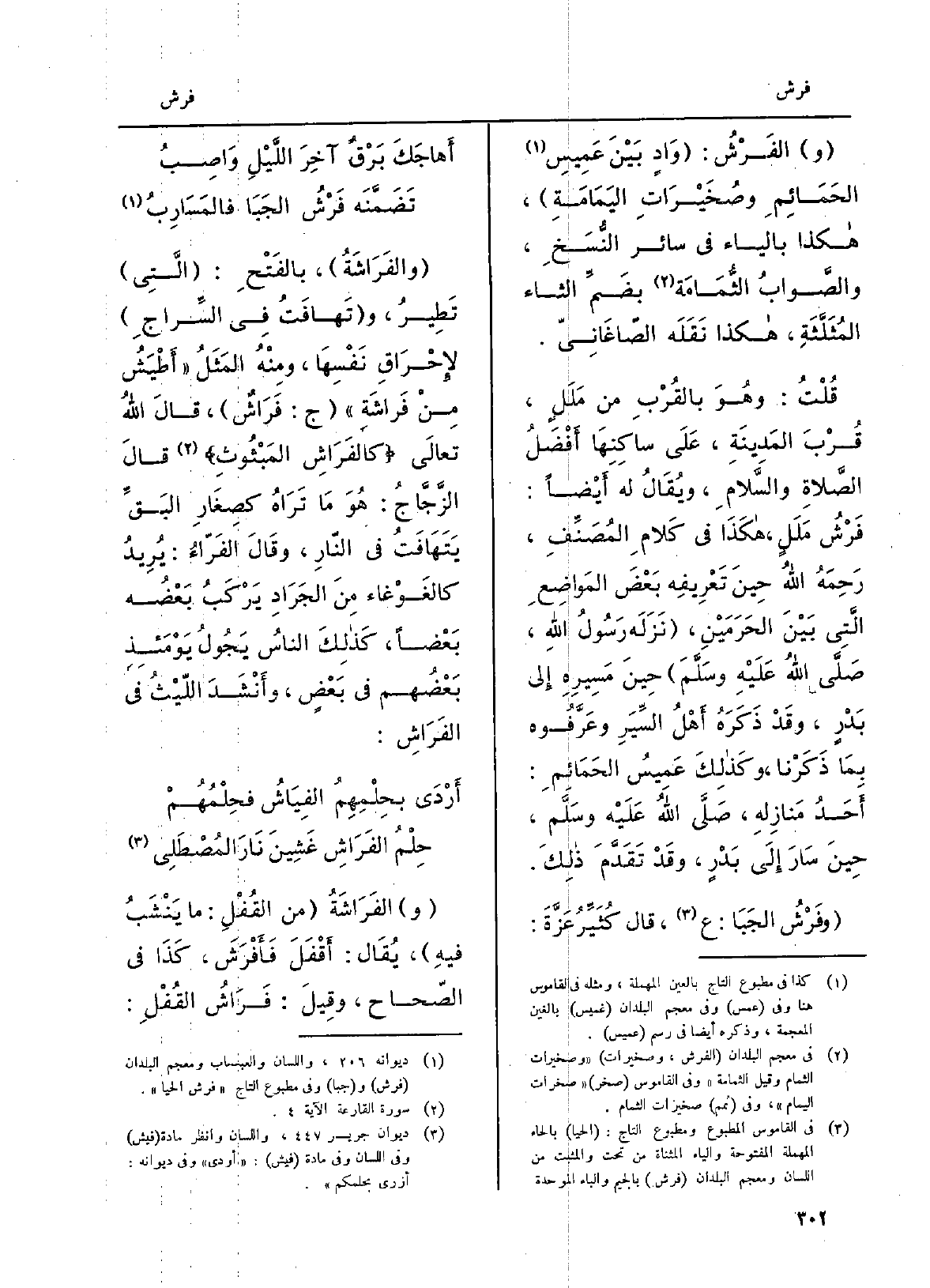 (و) الفَرْشُ: (وَادٍ بَيْنَ عَمِيسِ الحَمَائِمِ وصُخَيْرَاتِ اليَمَامَةِ) ، هَكَذَا بِالْيَاءِ فِي سَائِر النُّسَخِ، وَالصَّوَاب الثُّمَامَة بضمِّ الثَّاء المُثَلَّثَةِ، هَكَذَا نَقَلَه الصّاغَانِى. قُلْتُ: وهُوَ بالقُرْبِ من مَلَلٍ، قُرْبَ المَدِينَةِ، عَلَى ساكِنِهَا أَفْضَلُ الصَّلاة والسَّلام، ويُقَالُ لَهُ أَيْضاً: فَرْشُ مَلَلٍ، هكَذَا فِي كَلامِ المُصَنِّفِ، رَحِمَةُ الله حِينَ تَعْرِيفِه بعض المواضِعِ الَّتِى بَيْنَ الحَرَمَيْنِ، (نَزَلَه رَسُولُ الله، بَدْرٍ، وَقد ذَكَرَهُ أَهْلُ السَّيَرِ وعَرَّفُوه بِمَا ذَكَرْنا، وَكَذَلِكَ عَمِيُس الحَمَائِمِ: أَحَدُ مَنازِلِه،