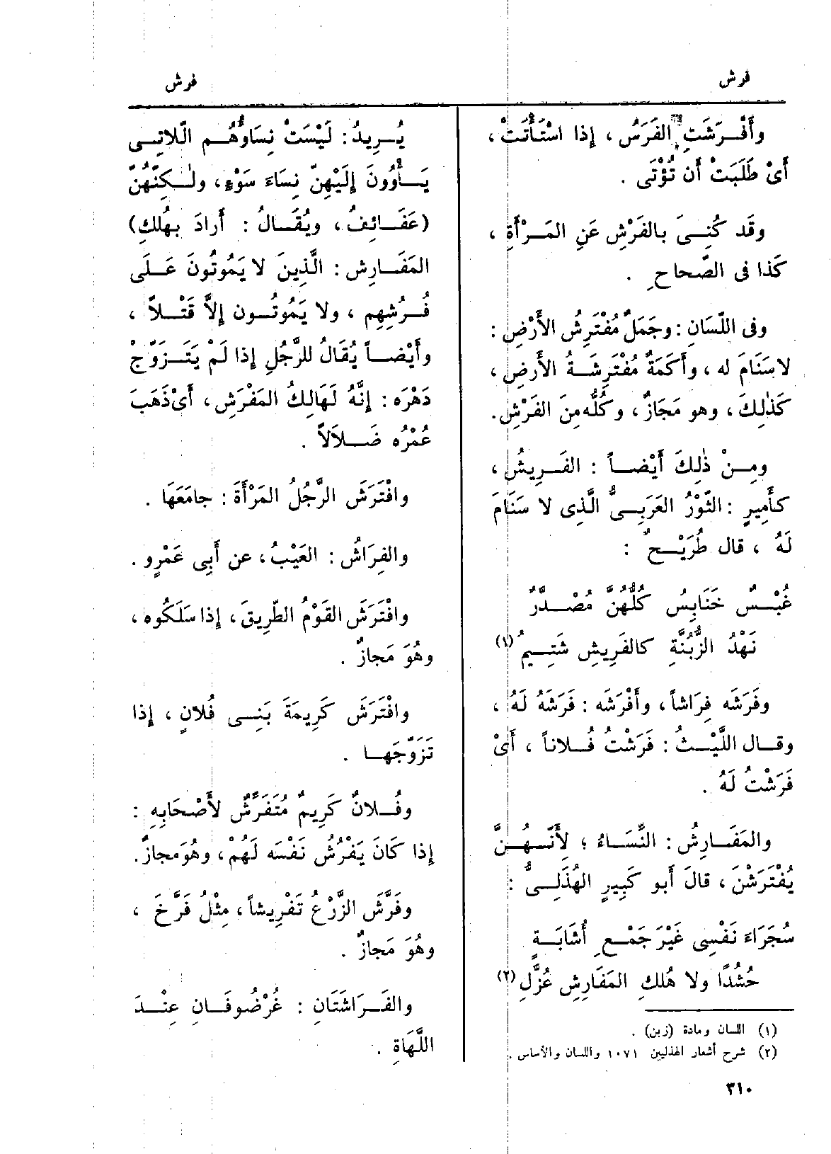 يُرِيدُ: لَيْسَتْ نِسَاؤُهُم الّلاتِي يَأْوُونَ إِلَيْهِنّ نِسَاءَ سَوْءٍ، ولكِنّهُنّ عَفَائِفُ، ويُقَالُ: أَرادَ بهُلكِ المَفَارِش: الَّذِينَ لَا يَمُوتُونَ عَلَى فُرُشِهِم، وَلَا يَمُوتُون إِلاَّ قَتْلاً، وأَيْضاً يُقَالُ للرَّجُلِ إَذا لَمْ يَتَزَوّجْ دَهْرَه: إِنَّهُ لَهَالِكُ المَفْرَشِ، أَيْ ذَهَبَ عُمْرُه ضَلالاً. وافْتَرَشَ الرَّجُلُ المَرْأَةَ: جامَعَهَا. والفِرَاشُ: العَيْبُ، عَن أَبِي عَمْروٍ. وافءتَرَشَ القَوْمُ الطّرِيقَ، إِذا سَلَكُوه، وهُوَ مَجازٌ. وافْتَرَشَ كَرِيمَةَ بَنِي فُلانٍ، إِذا تَزَوّجَها. وفُلانٌ كَرِيمٌ مُتَفَرِّشٌ لأَصْحَابِهِ: إِذا كَانَ يَفْرُشُ نَفْسَه لَهُمْ، وهُوَ مجازٌ.