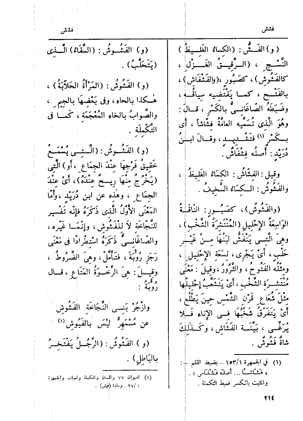 و {الفَشّ: الكِساءُ الغَلِيظُ النَّسْجِ، الرَّقِيقُ الغَزْلِ،} كالفَشُوشِ، كصَبُورٍ، {والفَشْفَاشِ، بالفَتْح، كَمَا يَقْتَضِيه سِياقُه، وضَبَطَهُ الصّاغَانِيُّ بالكَسْرِ، قالَ: وهُوَ الَّذِي تُسَمِّيه العامَّةُ فِشّاشاً، أَي بكَسْرٍ فتَشْدِيدٍ، وقالَ ابنُ دُرَيْدٍ: أَصْلُه} فِشْفَاشٌ. وقِيل: {الفِشّاشُ: الكِسَاءُ الغَلِيظُ،} والفَشُوشُ: الكِسَاءُ السَّخِيفُ. {والفَشُوشُ، كصَبُورٍ: النّاقَةُ الوَاسِعَةُ الإِحْلِيلِ المُنْتَشِرَةُ الشَّخْبِ، وهِيَ الَّتِي يَنْفَشُّ لَبَنُهَا مِنْ غَيْرِ حَلْبٍ، أَيْ يَجْرِي، لِسَعَةِ الإِحْلِيلِ، ومِثْلُه الفَتُوحُ، والثَّرُورُ، وقِيلَ: مَعْنَى مُنْتَشِرَةِ الشَّخْبِ، أَيْ يَتَشَعَّبُ إِحْلِيلُها مِثْلَ شُعَاعِ قَرْنِ الشَّمْسِ حِينَ يَطْلُع، أَيْ يَتَفَرّقُ شَخْبُهَا فِي الإِناءِ فَلا يُرَغِّى، بَيِّنَه} الفَشَاشِ، وكذلِكَ شاةٌ {فَشُوشٌ.