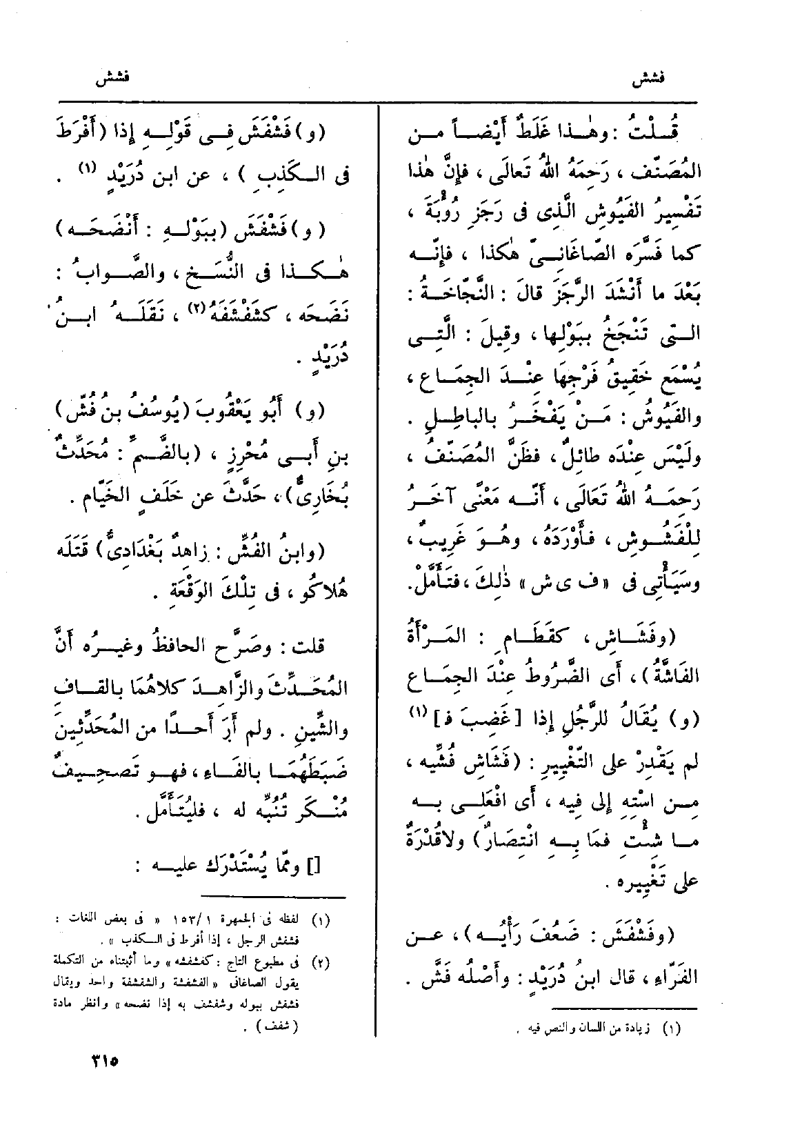 قُلْتُ: وَهَذَا غَلَطٌ أَيْضاً من المُصَنّف، رَحِمَهُ الله تَعالَى، فإِنَّ هَذَا تَفْسِيرُ الفَيُوشِ الَّذِي فِي رَجَزِ رُؤْبَةَ، كَمَا فَسَّرَه الصّاغَانِيّ هَكَذَا، فإِنّه بَعْدَ مَا أَنْشَدَ الرَّجَزَ قالَ: النَّجّاخَةُ: الَّتِي تَنْجَخُ ببَوْلِها، وقِيلَ: الَّتِي يُسْمَع خَفِيقُ فَرْجِهَا عِنْدَ الجِمَاع، والفَيُوشُ: مَنْ يَفْخَرُ بالباطِلِ. ولَيْسَ عِنْدَهُ طائِلٌ، فظَنَّ المُصَنِّفُ، رَحِمَهُ اللهُ تَعالَى، أَنّه مَعْنَىً آخَرُ لِلْفَشُوشِ، فأَوْرَدَهُ، وهُوَ غَرِيبٌ، وسَيَأْتِي فِي ف ي ش ذلِكَ، فَتَأَمَّلْ. {وفَشَاشِ، كقَطَامِ: المَرْأَةُ} الفَاشَّةُ، أَي الضَّرُوطُ عِنْدَ الجِمَاع ويُقَالُ للرَّجُلِ إِذا غَضِبَ لم يَقْدِرْ على التّغْيِيرِ: {فَشَاشِ} فُشِّيه، مِن استِهِ إِلى فِيه، أَي افْعَلِي بِهِ مَا شِئْتِ فمَا بِهِ انْتِصَارٌ وَلَا قُدْرَةٌ على تَغْيِيره. {وفَشْفَشَ: ضَعُفَ رَأْيُه، عَن الفَرّاءِ، قَالَ ابنُ دُرَيْدٍ: وأَصْلُه} فَشَّ. وفَشْفَشَ فِي قَوْلِهِ إِذا أَفْرَطَ فِي الكَذِبِ، عَن ابنِ دُرَيْدٍ.
