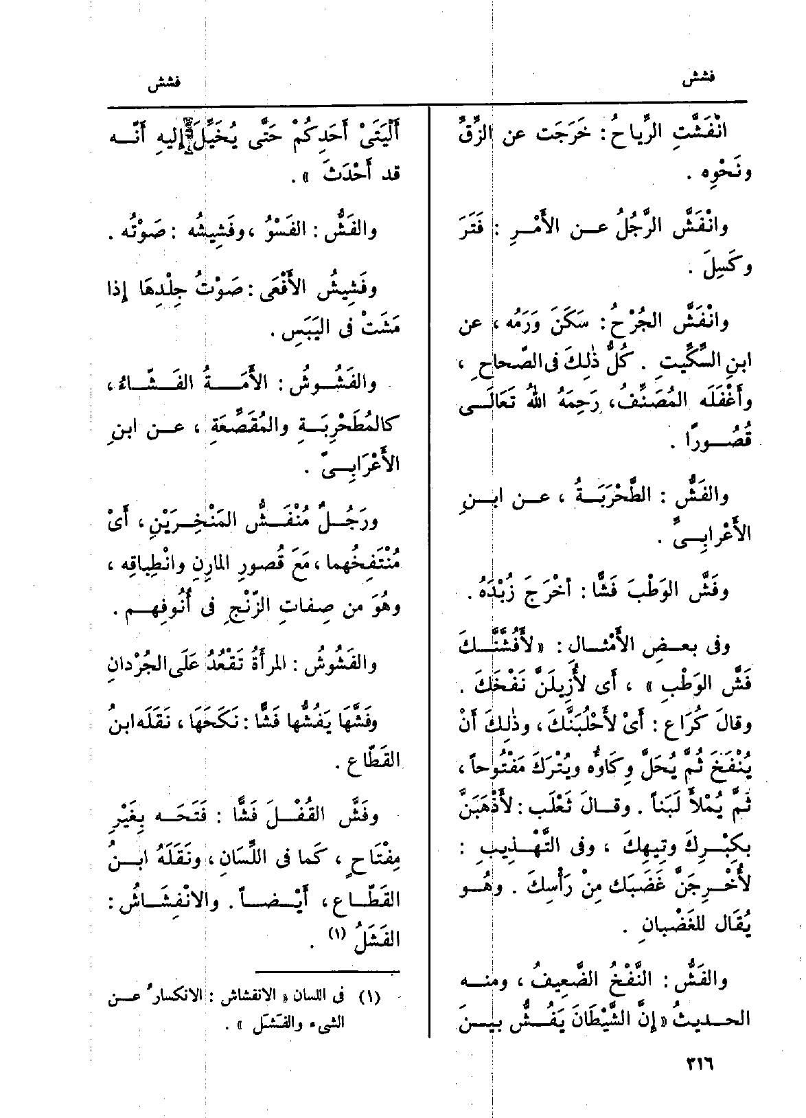 {انْفَشَّتِ الرِّياحُ: خَرَجَت عَن الزِّقِّ ونَحْوِه.} وانْفَشَّ الرَّجُلُ عَن الأَمْرِ: فَتَرَ وكَسِلَ. وانْفَشَّ الجُرْحُ: سَكَنَ وَرَمُه، عَن ابنِ السِّكِّيتِ. كُلُّ ذلِكَ فِي الصّحاحِ، وأَغْفَلَه المُصَنِّفُ، رَحِمَهُ اللهُ تَعَالَى قُصُوراً. {والفَشُّ: الطَّحْرَبَةُ، عَن ابنِ الأَعْرابِيِّ.} وفَشَّ الوَطْبَ {فَشّاً: أَخْرَجَ زُبْدَهُ. وَفِي بعض الأَمْثالِ:} لأَفُشَّنَّكَ {فَشَّ الوَطْبِ، أَي لأُزِيلَنَّ نَفْخَكَ. وقالَ كُرَاع: أَيْ لأَحْلُبَنَّكَ، وذلِكَ أَنْ يُنْفَخَ ثُمَّ يُحَلَّ وِكَاؤَهُ ويُتَرَكَ مَفْتُوحاً، ثُمَّ يُمْلأَ لَبَناً. وقالَ ثَعْلَب: لأَذْهَبَنَّ بِكِبْركَ وتِيْهِكَ، وَفِي التَّهْذِيبِ: لأُخْرِجَنَّ غَضَبَك مِنْ رَأْسِكَ. وهُو يُقَال للغَضْبَانِ.} والفَشُّ: النَّفْخُ الضَّعِيفُ، وَمِنْه الحديثُ إِنَّ الشَّيْطَانَ {يَفُشُّ بينَ أَلْيَتَيْ أَحَدِكُمْ حَتَّى يُخَيِّلَ إِليهِ أَنّه قد أَحْدَثَ.