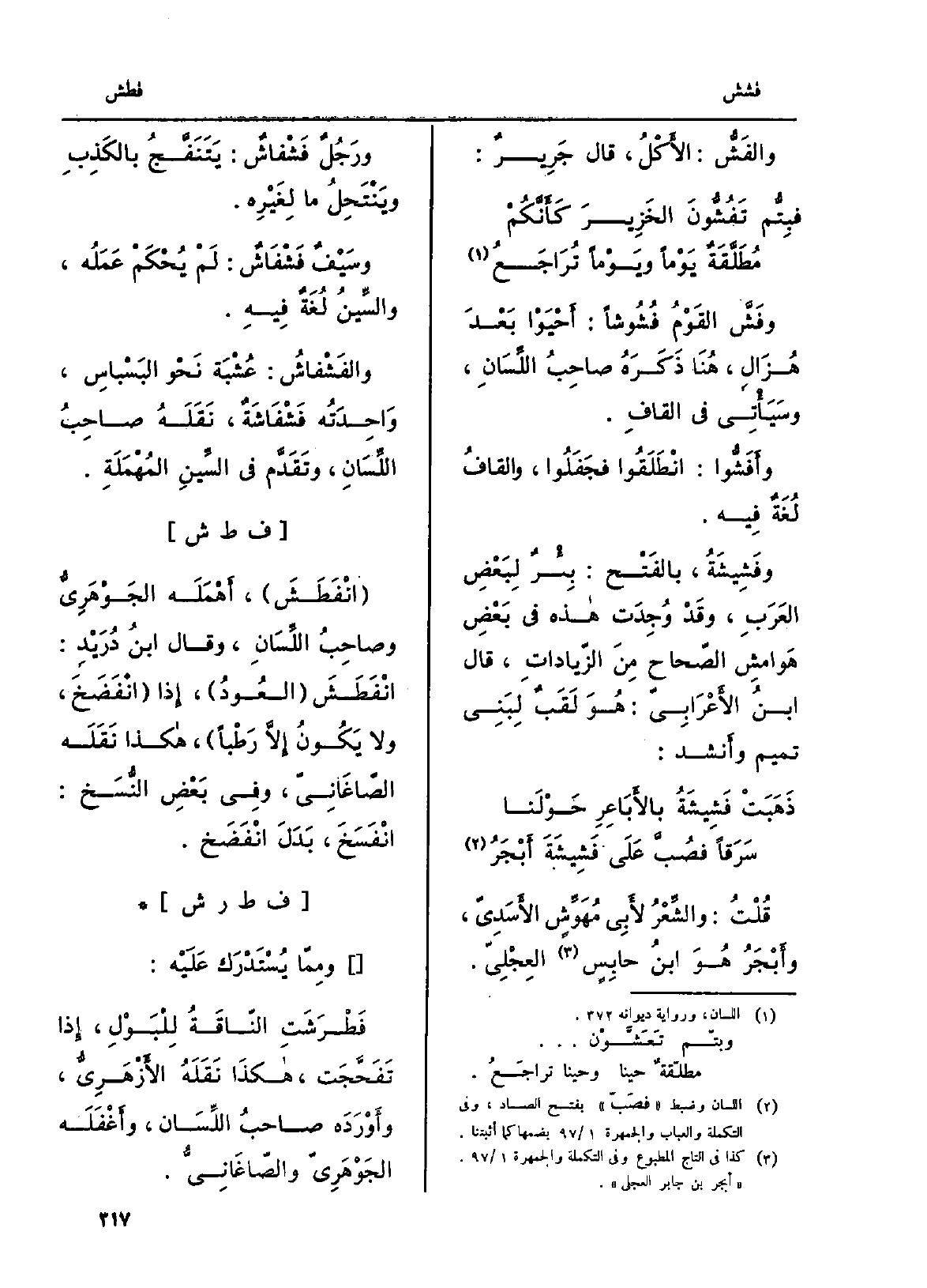 (ذَهَبْتْ {فَشِيشَةُ بالأَبَاعِرِ حَوْلَنا ... سَرَقاً فصُبَّ عَلَى} فَشِيشَةَ أَبْجَرُ)